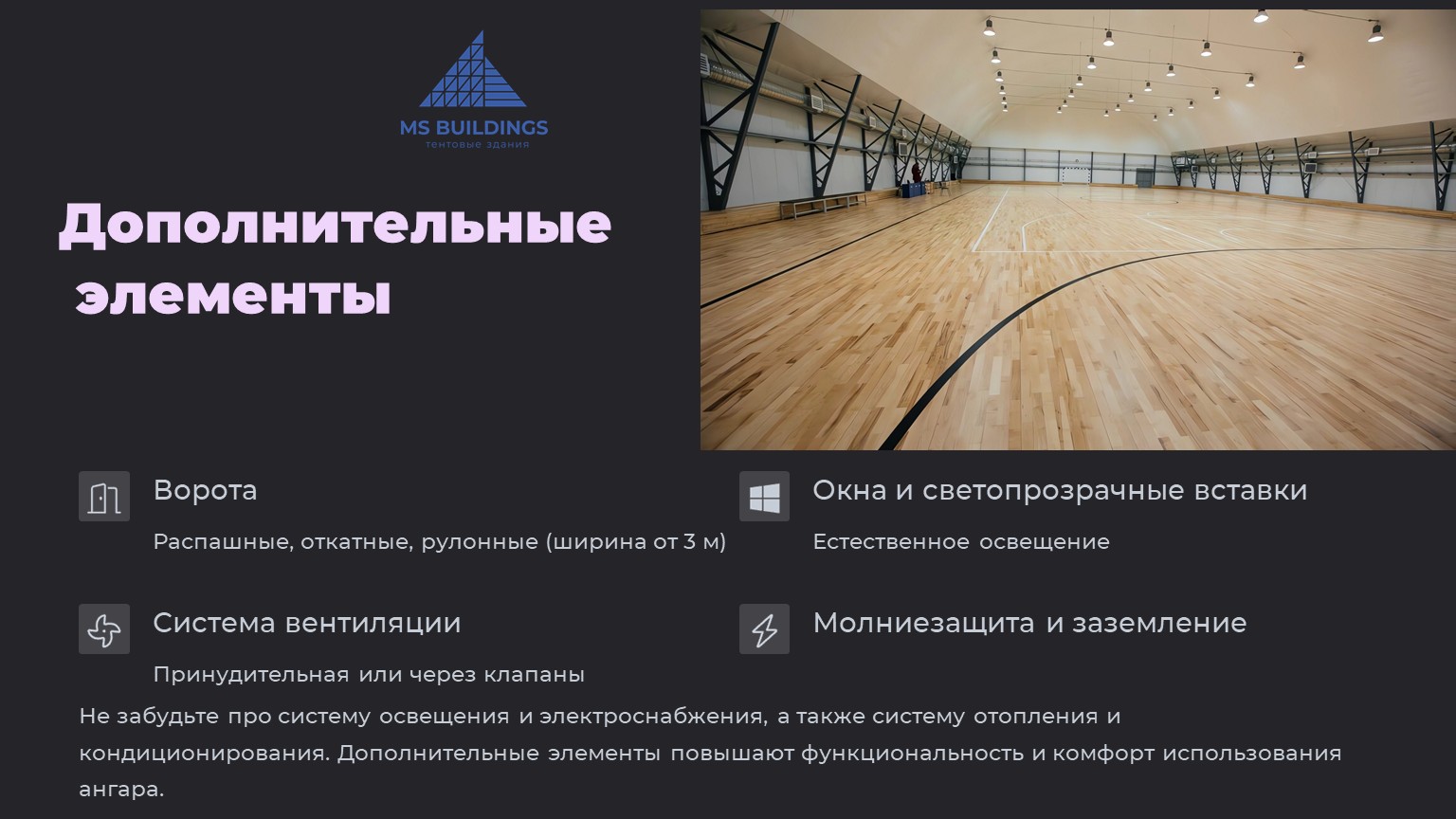 Склады, ангары для сельского хозяйства, спортзалы, логистические центры, спортивные арены, центры организации торговли |