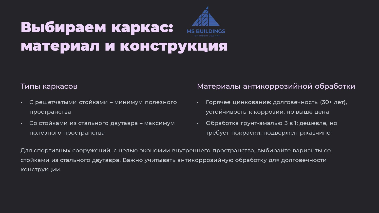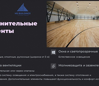Совет: Для спортивных сооружений, с целью экономии внутреннего пространства, выбирайте варианты со стойками из стального двутавра.
