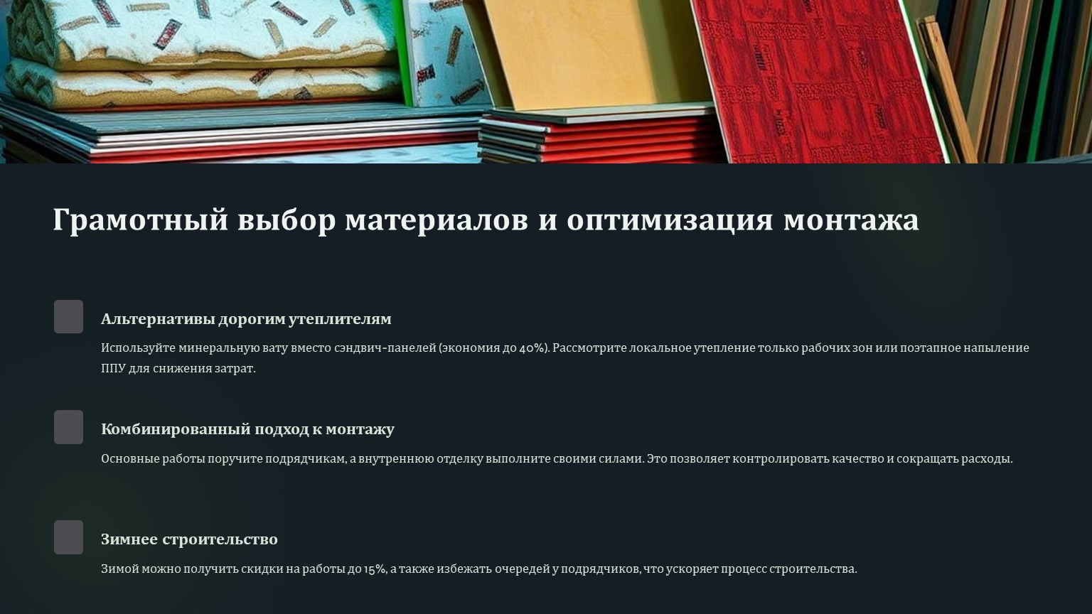 - Минеральная вата вместо сэндвич-панелей (-40%)