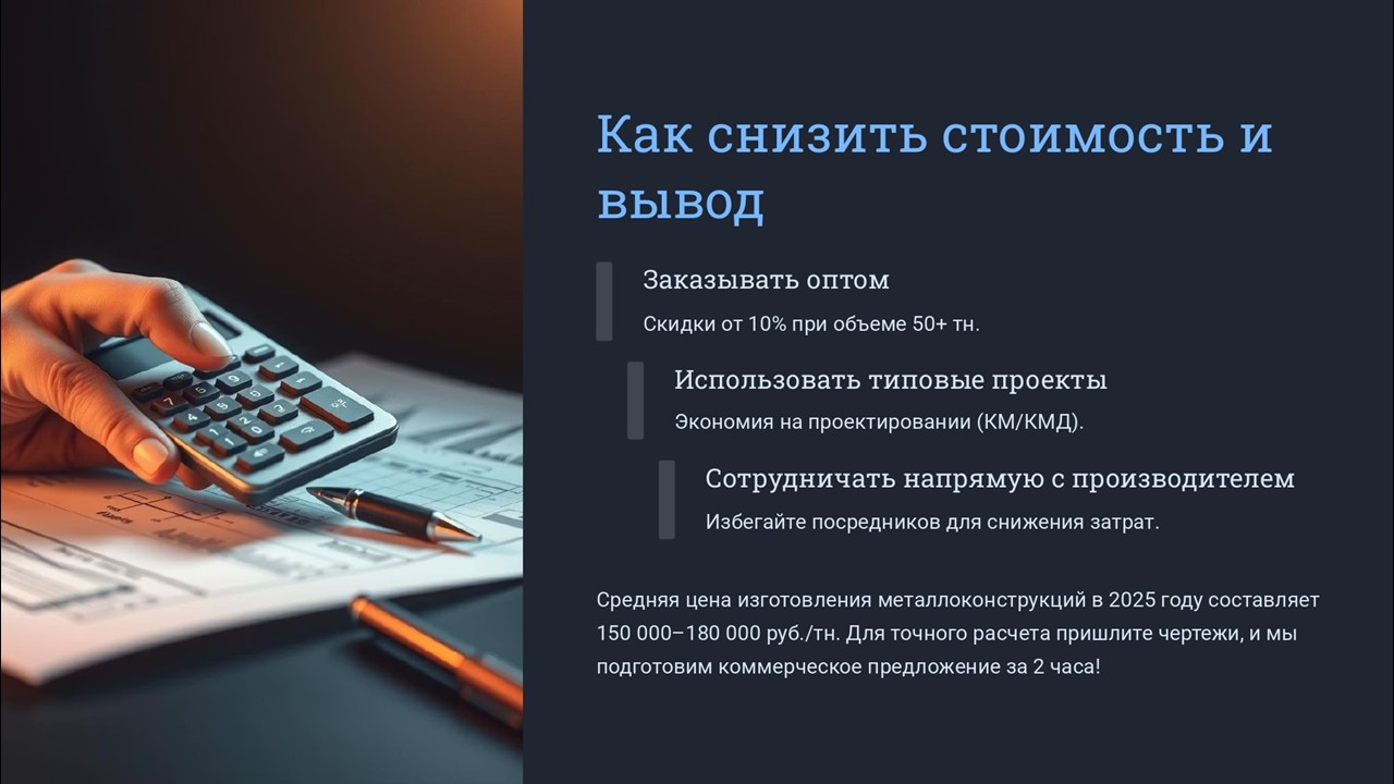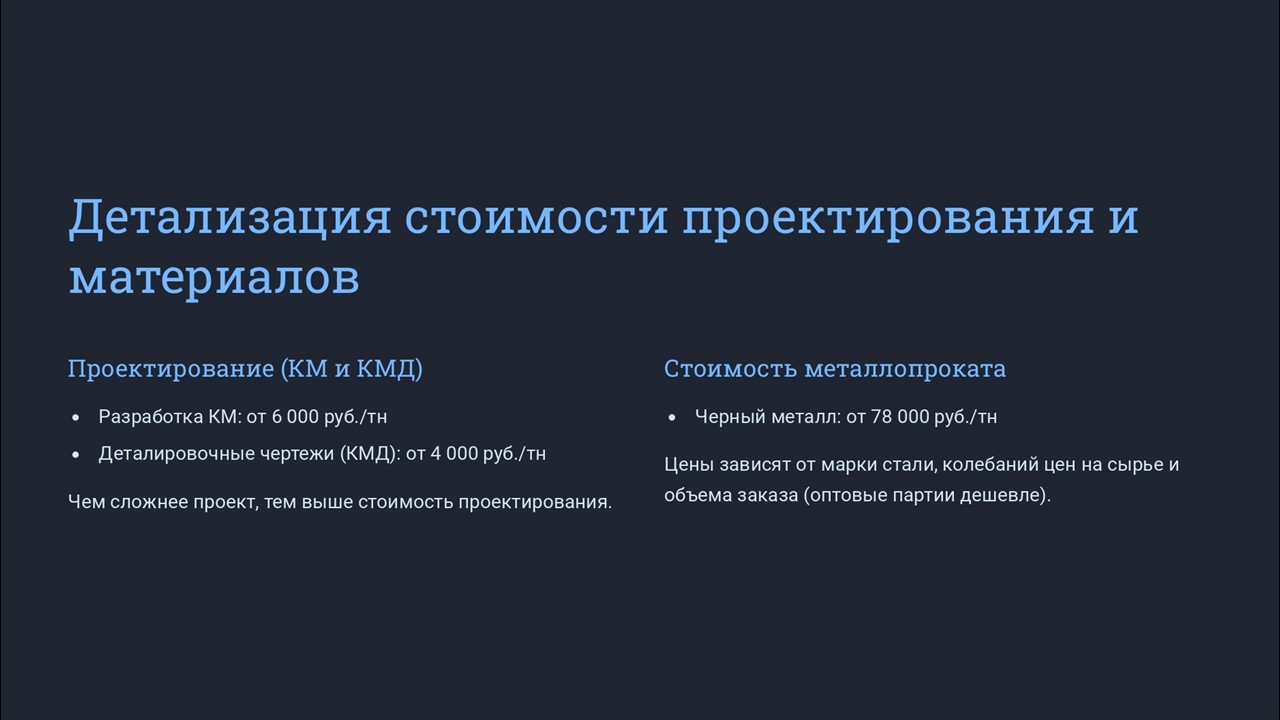 Средняя цена изготовления металлоконструкций в 2025 году составляет 150 000–180 000 руб./тн в зависимости от типа объекта и сложности.