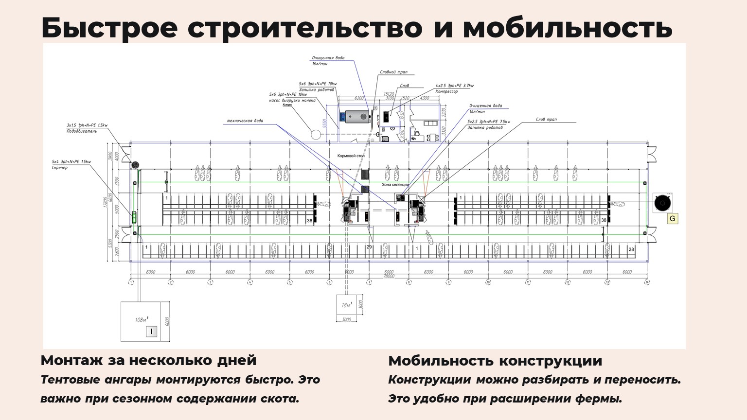 В отличие от капитальных построек, тентовые ангары монтируются за несколько дней. Это особенно важно при сезонном содержании скота или необходимости быстрого расширения фермы. Конструкции можно разбирать и переносить на новое место.