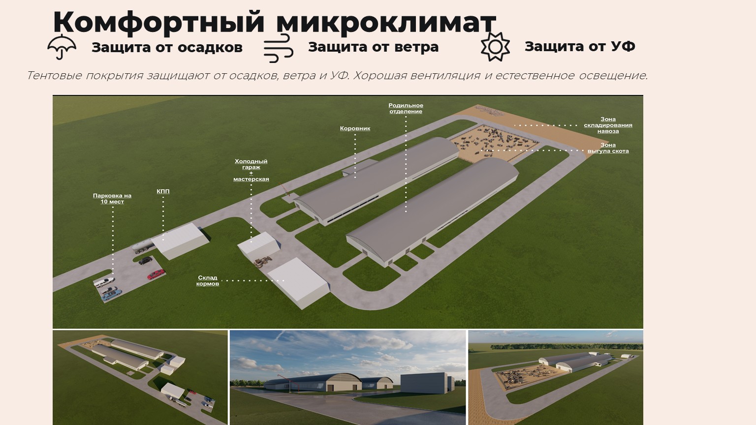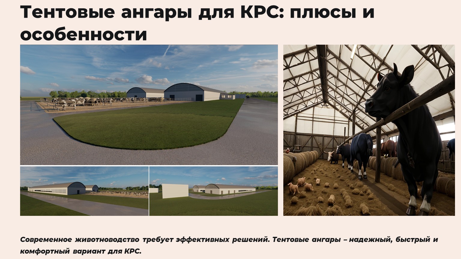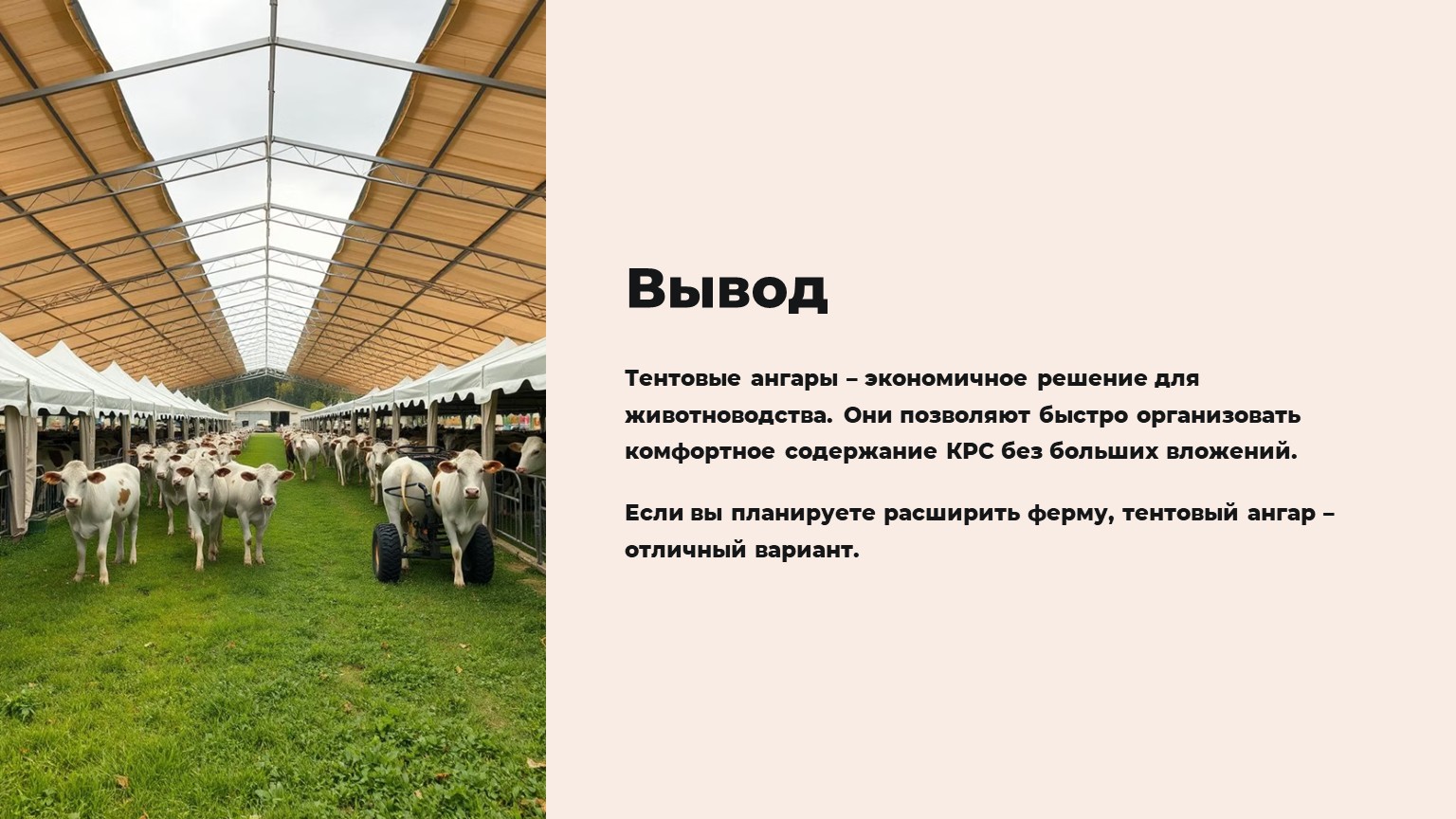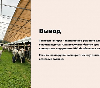 Тентовые ангары – это современное и экономичное решение для животноводческих хозяйств. Они позволяют быстро организовать комфортное содержание КРС без больших капитальных вложений. Благодаря мобильности, прочности и возможности адаптации такие конструкции становятся все популярнее среди фермеров.