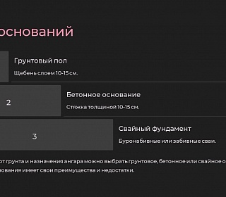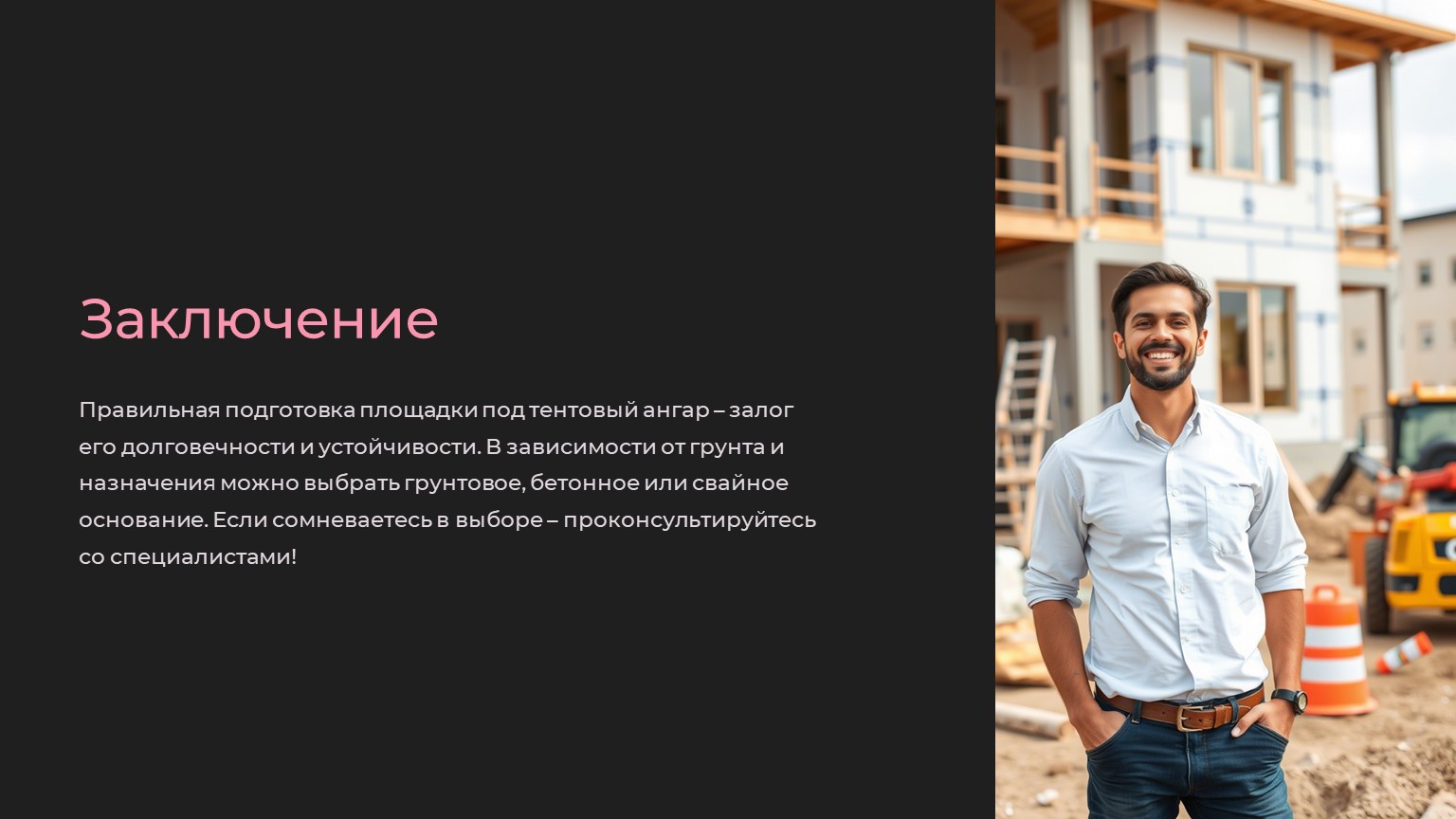 Правильная подготовка площадки под тентовый ангар – залог его долговечности и устойчивости. В зависимости от грунта и назначения можно выбрать грунтовое, бетонное или свайное основание. Если сомневаетесь в выборе – проконсультируйтесь со специалистами!