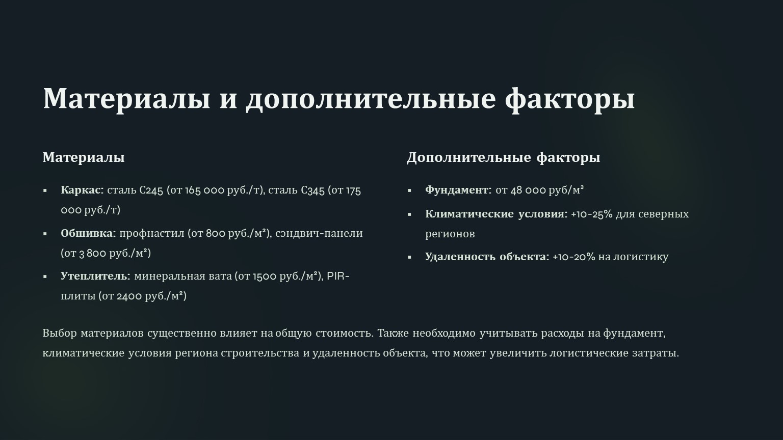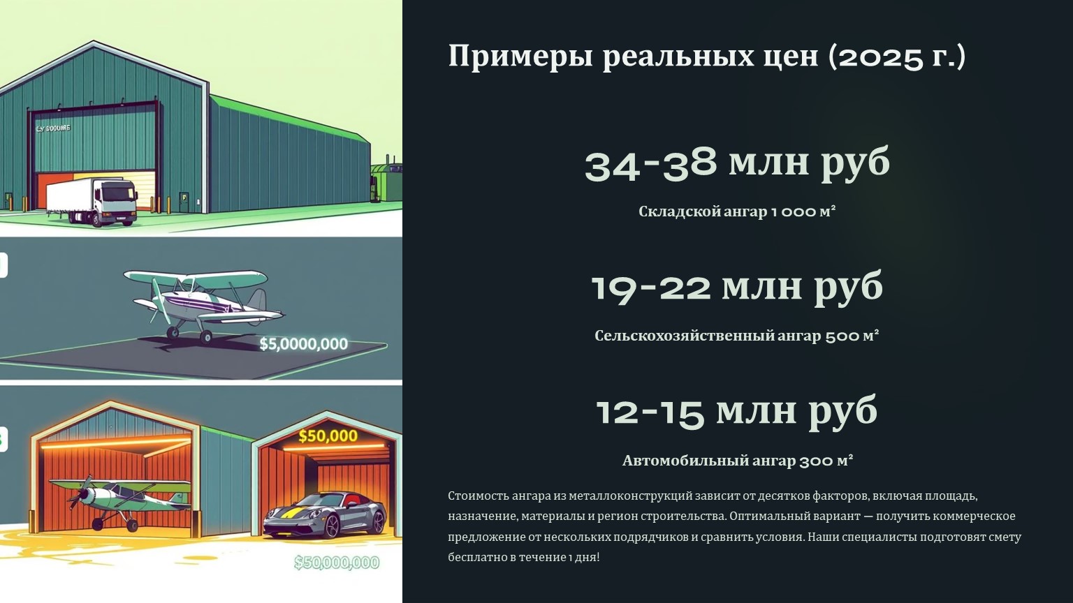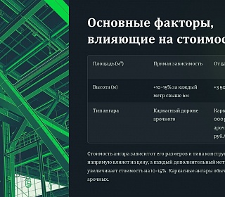 Стоимость ангара из металлоконструкций зависит от десятков факторов. Для точного расчета нужно учитывать не только площадь, но и назначение, материалы и регион строительства. Оптимальный вариант — получить коммерческое предложение от нескольких подрядчиков и сравнить условия.