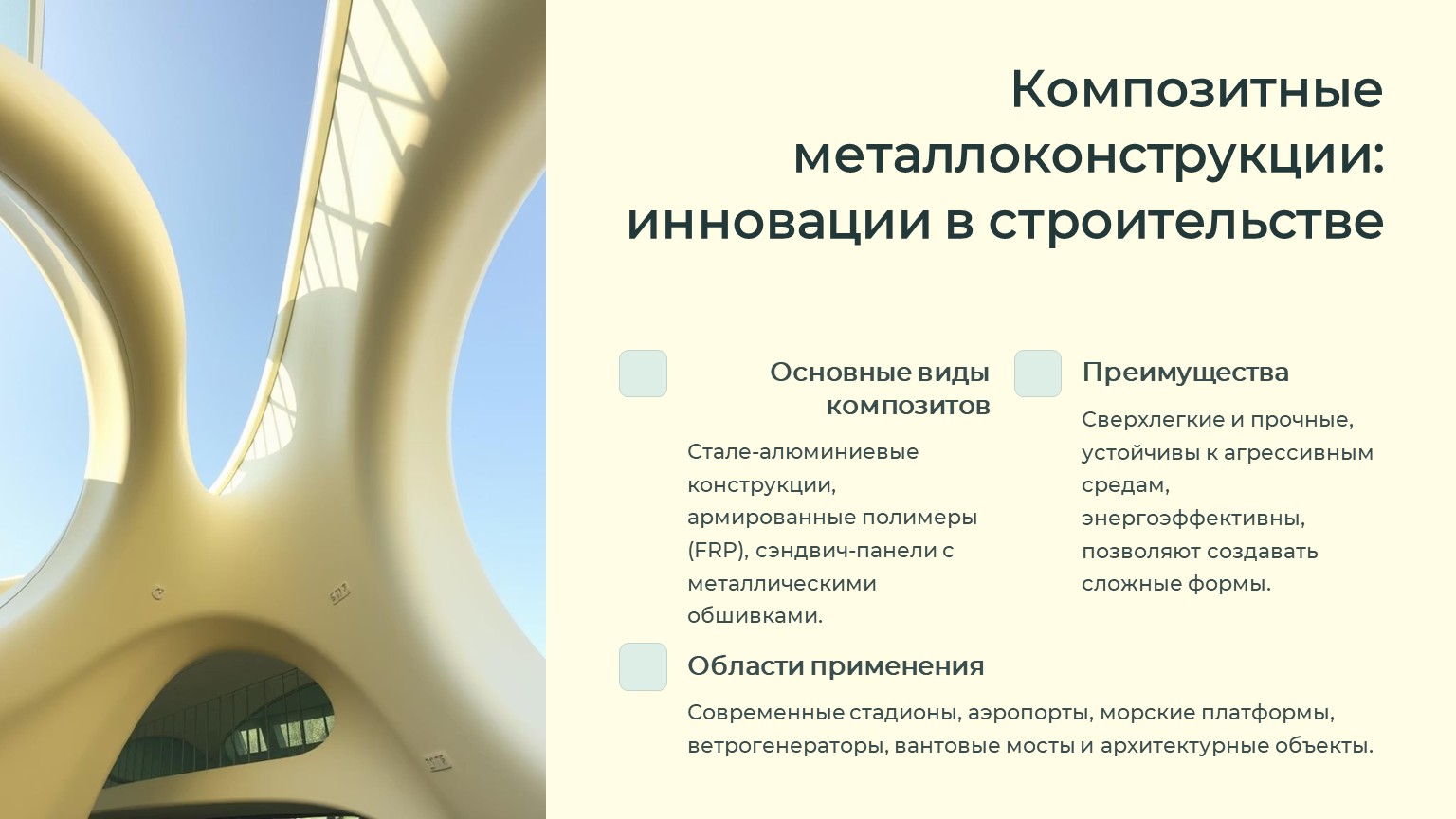 ✔ Для инновационных проектов – композиты (малый вес + долговечность).