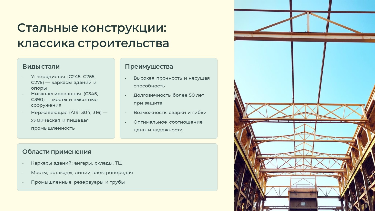 ✔ Для промышленных зданий и мостов – сталь (оптимальная цена и прочность).