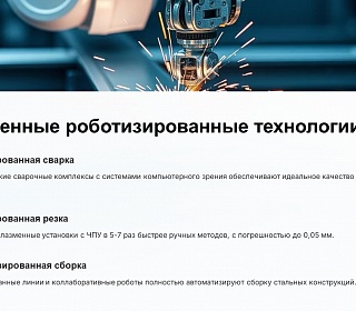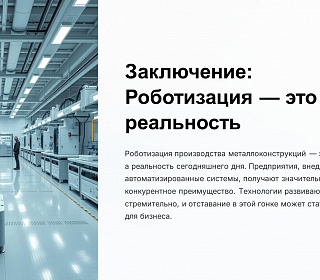 Роботизация производства металлоконструкций - это не будущее, а реальность сегодняшнего дня. Предприятия, внедряющие автоматизированные системы, получают значительное конкурентное преимущество. Технологии развиваются стремительно, и отставание в этой гонке может стать критическим для бизнеса.