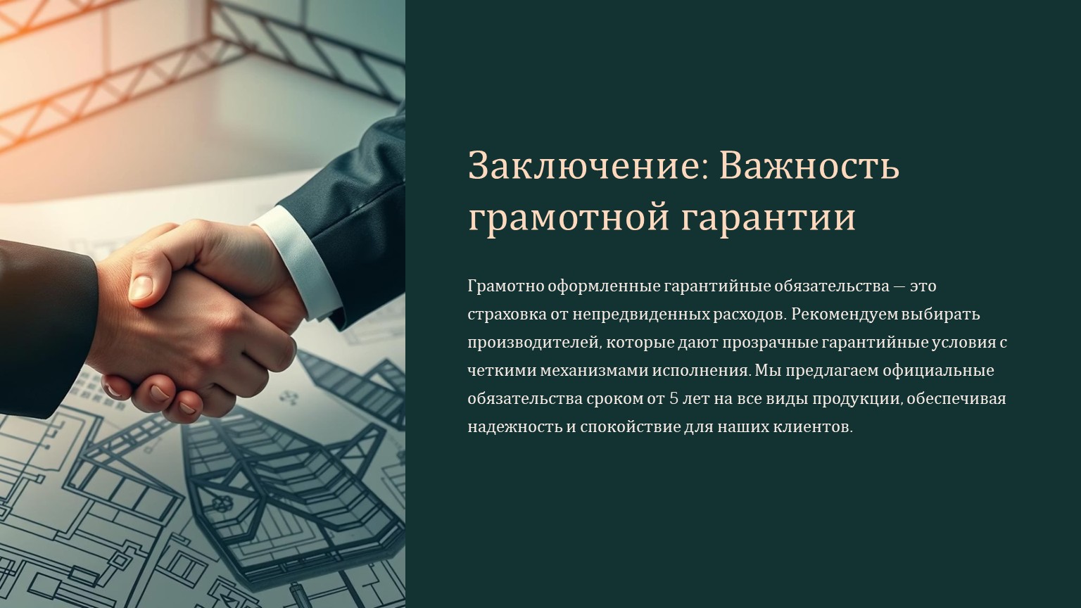 Грамотно оформленные гарантийные обязательства — это страховка от непредвиденных расходов. Рекомендуем выбирать производителей, которые дают прозрачные гарантийные условия с четкими механизмами исполнения.
