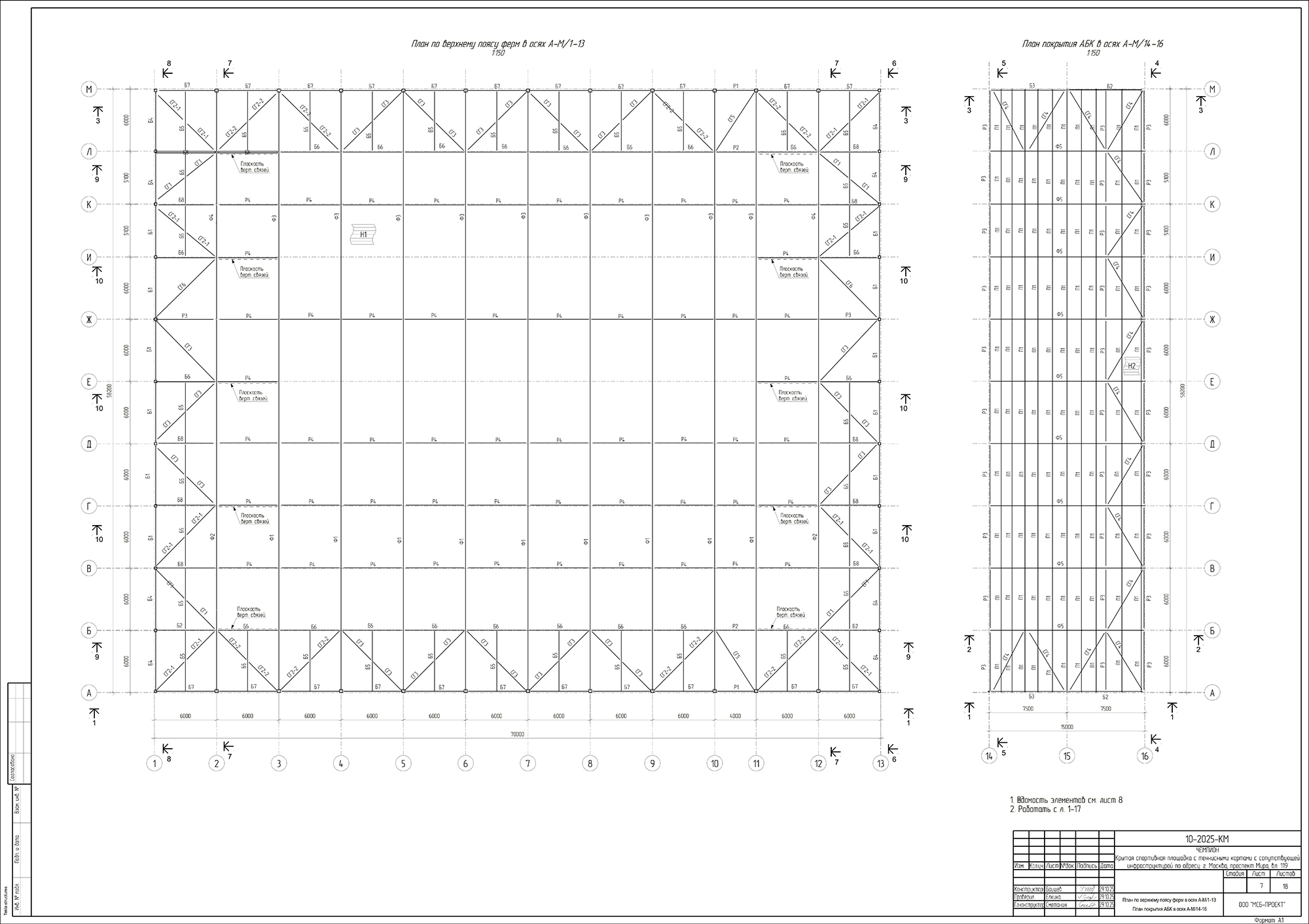 · Устойчивость: обеспечивается за счёт жёсткого защемления колонн, системы горизонтальных и вертикальных связей, а также профлиста (для верхних поясов ферм) и распорок (для нижних поясов)