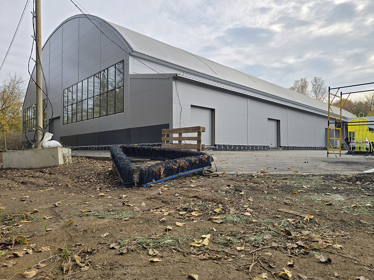 · Устройство ограждающих конструкций из трёхслойных тентовых панелей собственного производства.