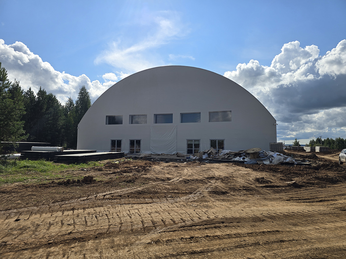Здания построены по каркасной технологии с использованием прочных металлических арок. Конструкция обеспечивает высокую устойчивость к ветровым и снеговым нагрузкам, что особенно важно для эксплуатации в условиях России.