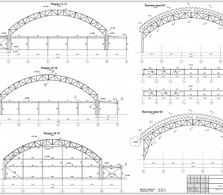 Опирание арок на фундамент - шарнирное. Сопряжение элементов конструкции между собой выполняется из листовой стали. Схема покрытия прогонная. Прогоны разрезные, шарнирно опирающиеся на арки. В поперечном направлении общая устойчивость конструкции обеспечивается за счет жесткого сопряжения арок и колонн. Устойчивость арок из плоскости по верхнему поясу обеспечивается прогонами, связями между прогонами и связями между верхними и нижними поясами.Устойчивость арок по нижним поясам обеспечивается системой вертикальных и горизонтальных связей и распорок.