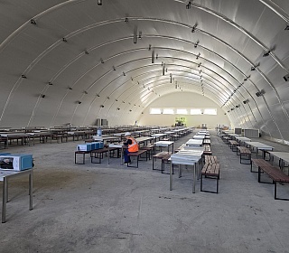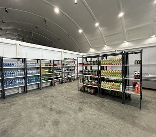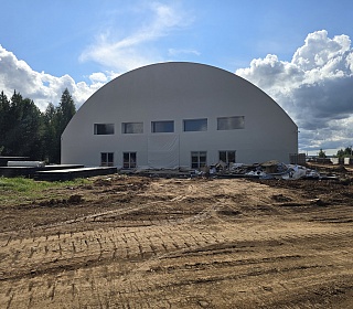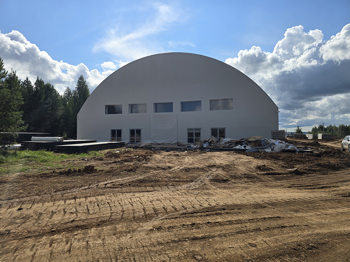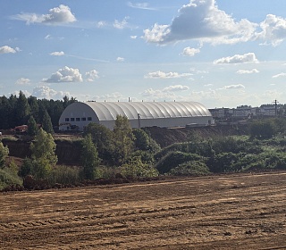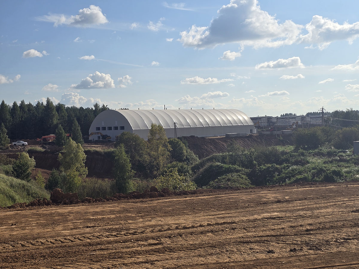 Особенности объекта: Каркас из стальных арок, трехслойное тентовое покрытие AIGLE, высота в коньке 13,05 м, полное оснащение (отопление, вентиляция, освещение, видеонаблюдение).