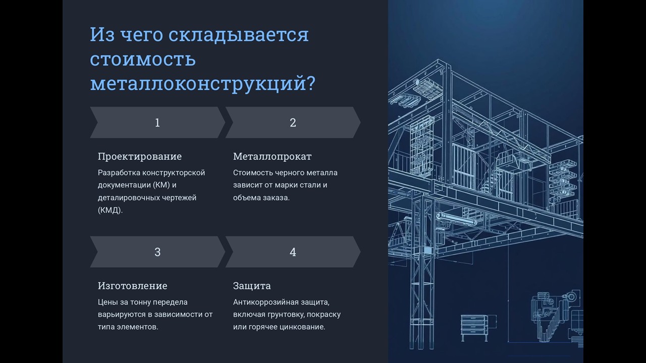 Цена изготовления металлоконструкций формируется из нескольких основных компонентов: