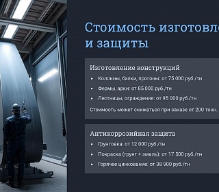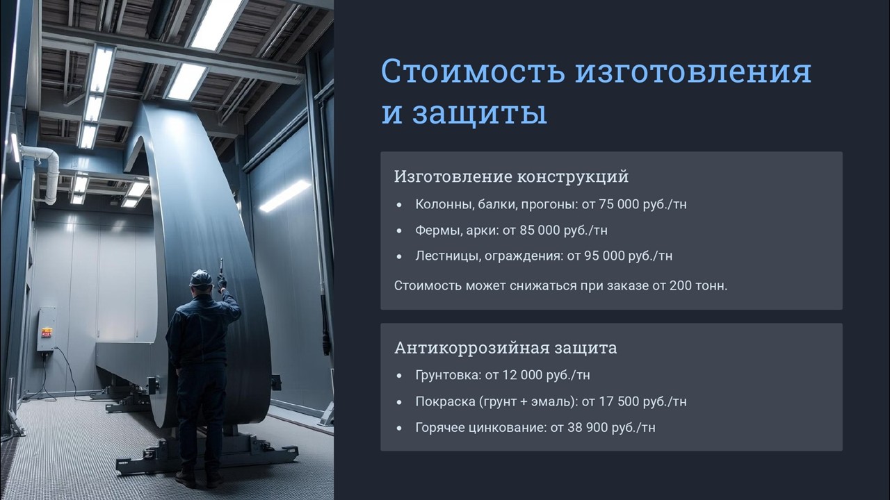 Средняя цена изготовления металлоконструкций в 2025 году составляет 150 000–180 000 руб./тн в зависимости от типа объекта и сложности.