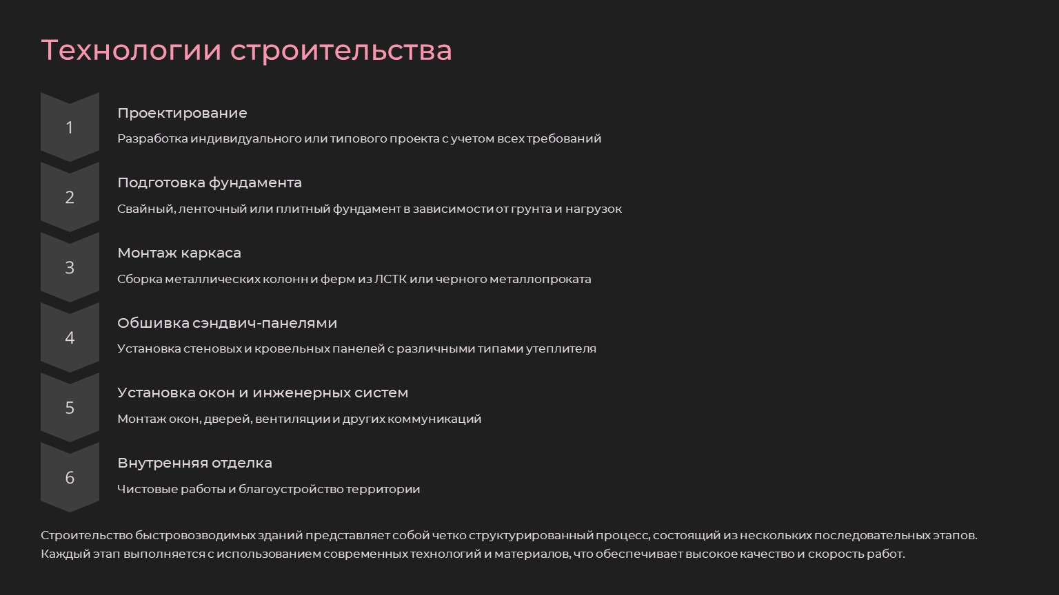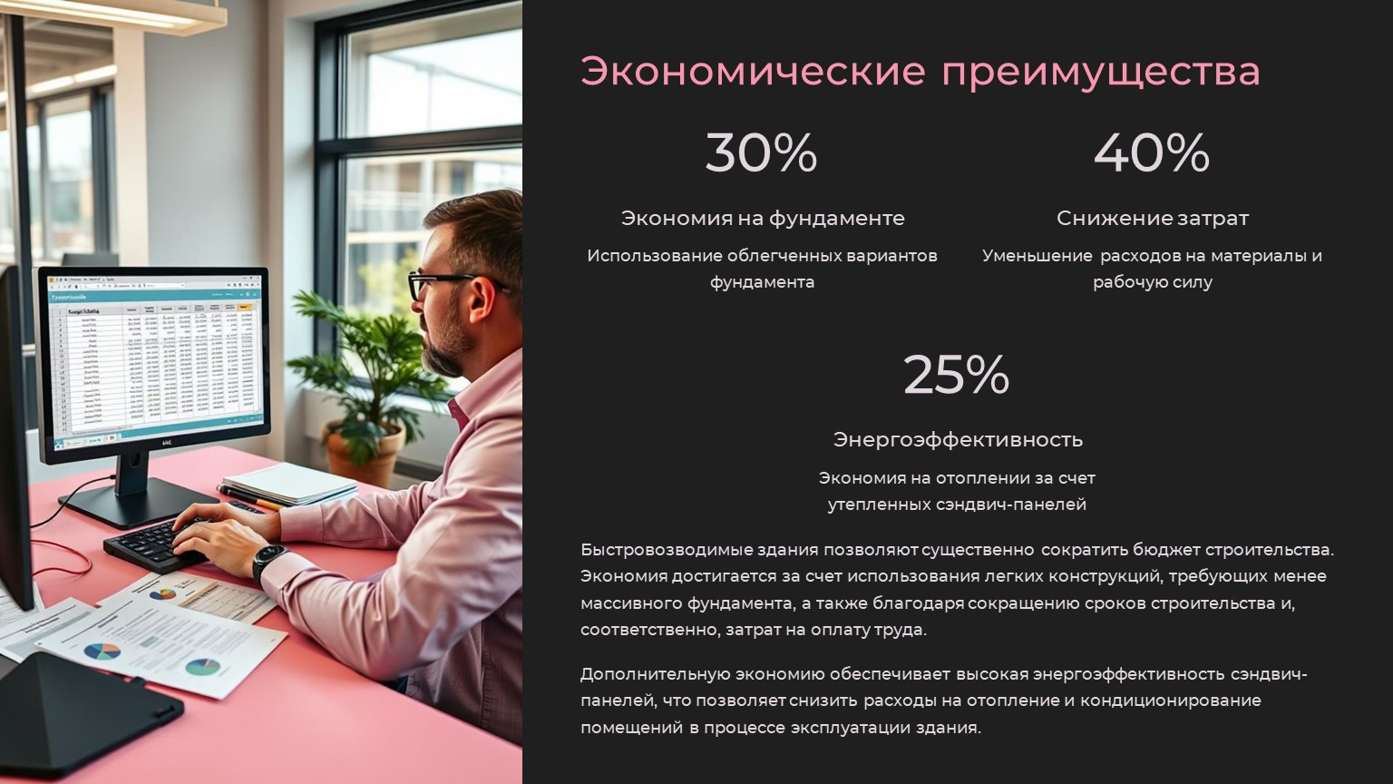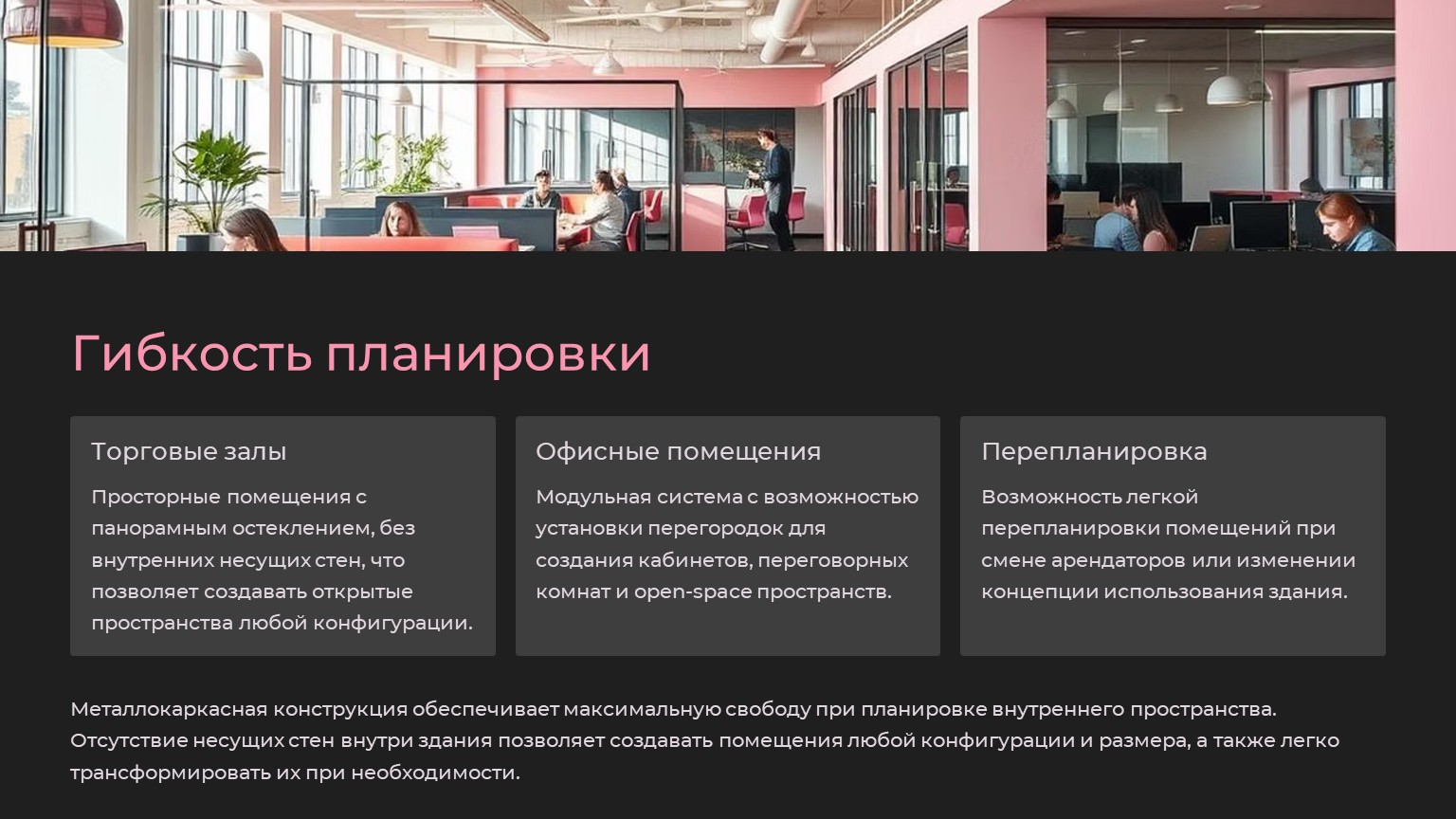 Сроки возведения зданий из металлокаркаса и сэндвич-панелей в 2–3 раза меньше, чем у традиционных кирпичных или монолитных конструкций. Полноценный торговый центр или офисный комплекс можно построить за 3–6 месяцев.