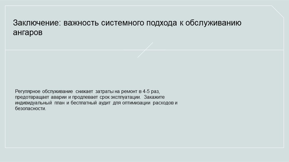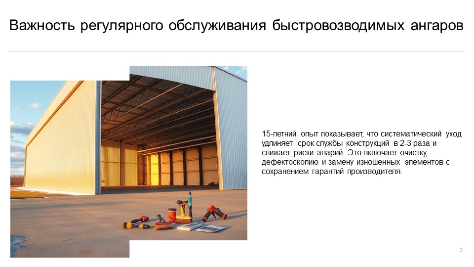 Правильно организованное обслуживание ангара снижает затраты на ремонт в 4-5 раз. Ключевое правило — профилактика, а не аварийное восстановление.