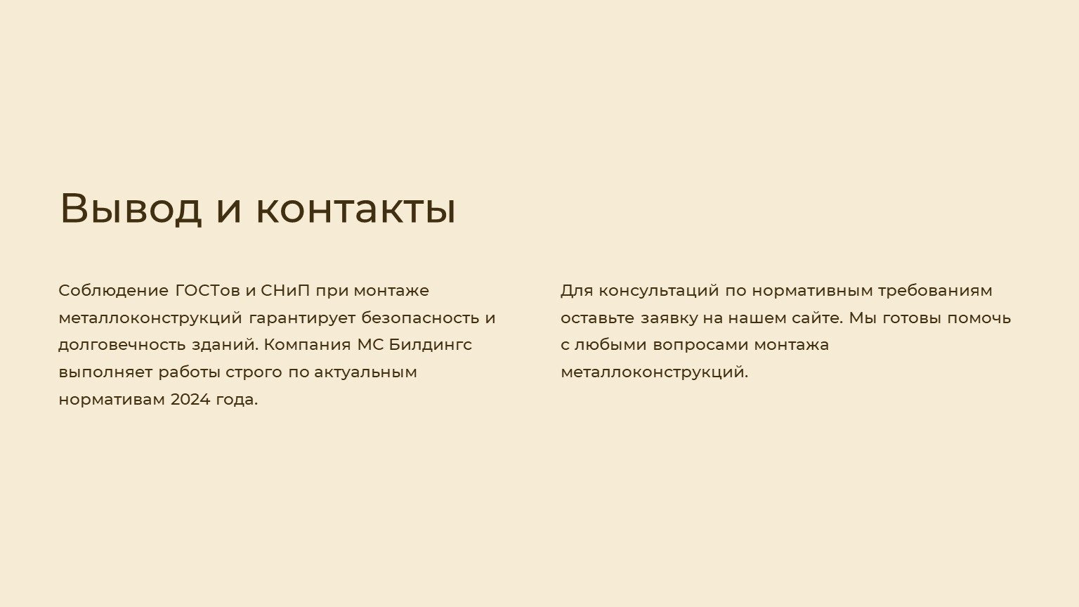 Соблюдение ГОСТов и СНиП при монтаже металлоконструкций - гарантия безопасности и долговечности зданий. Компания МС Билдингс выполняет все работы в строгом соответствии с актуальными нормативами 2024 года.
