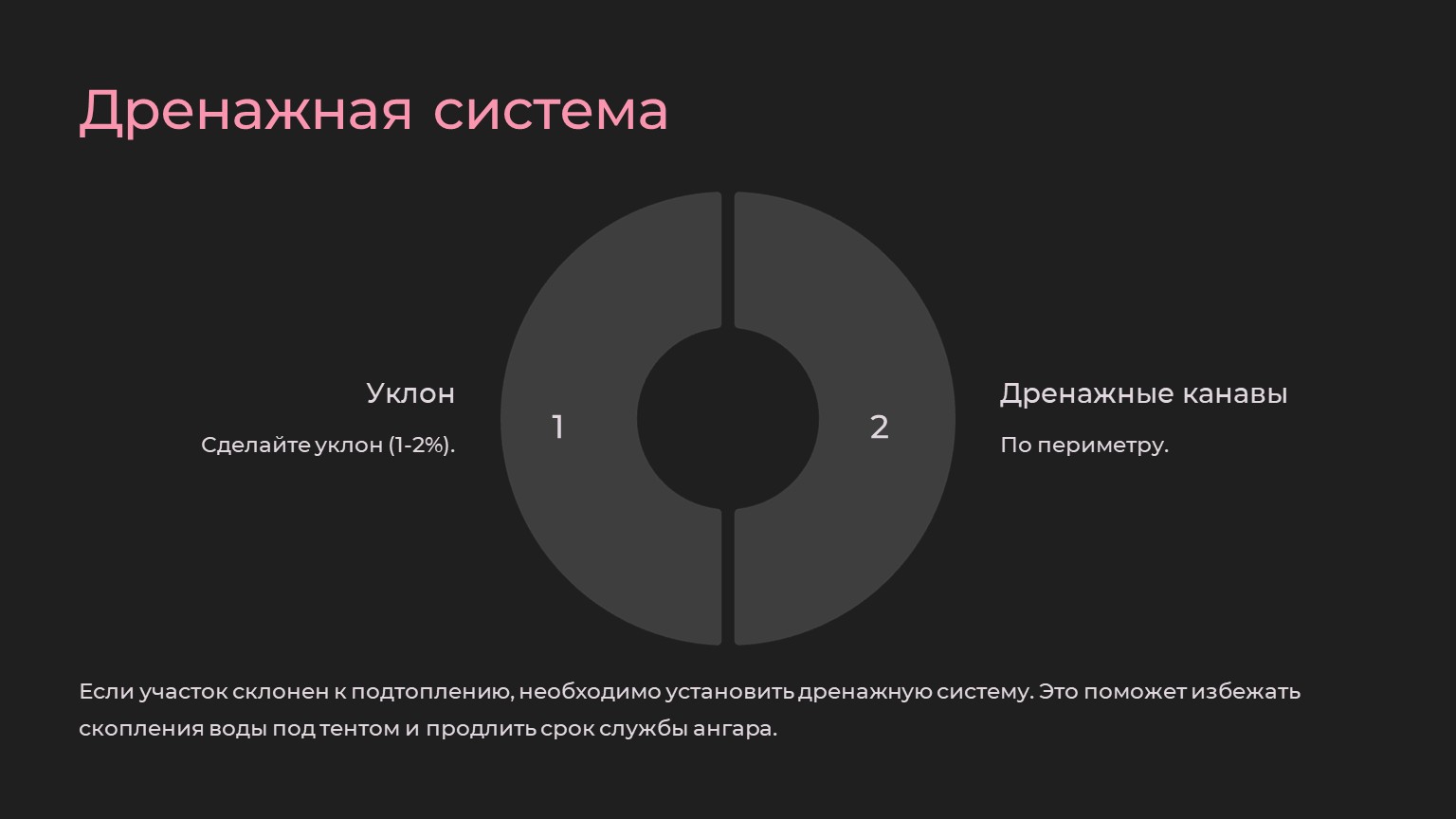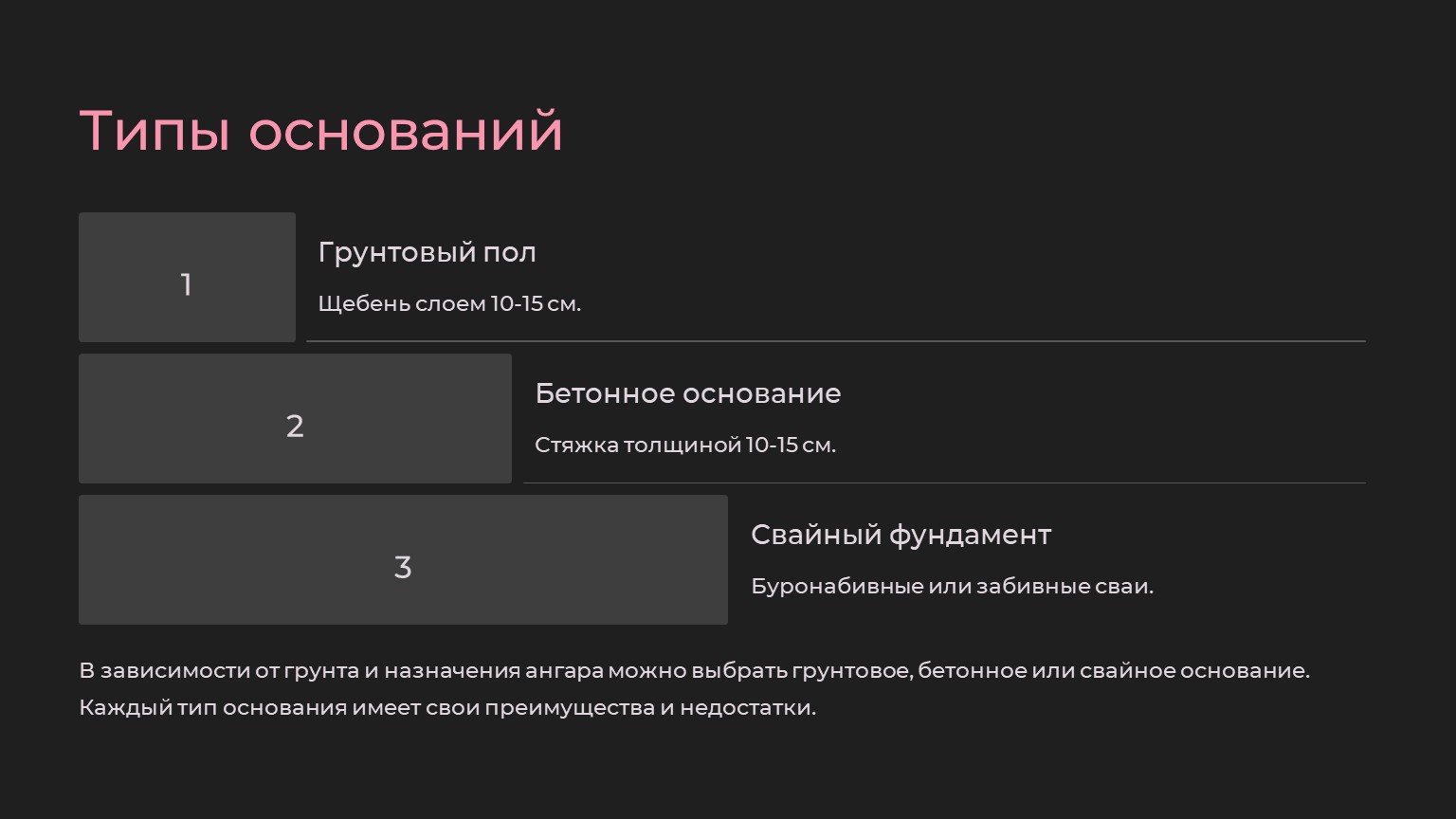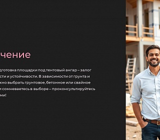 Правильная подготовка площадки под тентовый ангар – залог его долговечности и устойчивости. В зависимости от грунта и назначения можно выбрать грунтовое, бетонное или свайное основание. Если сомневаетесь в выборе – проконсультируйтесь со специалистами!