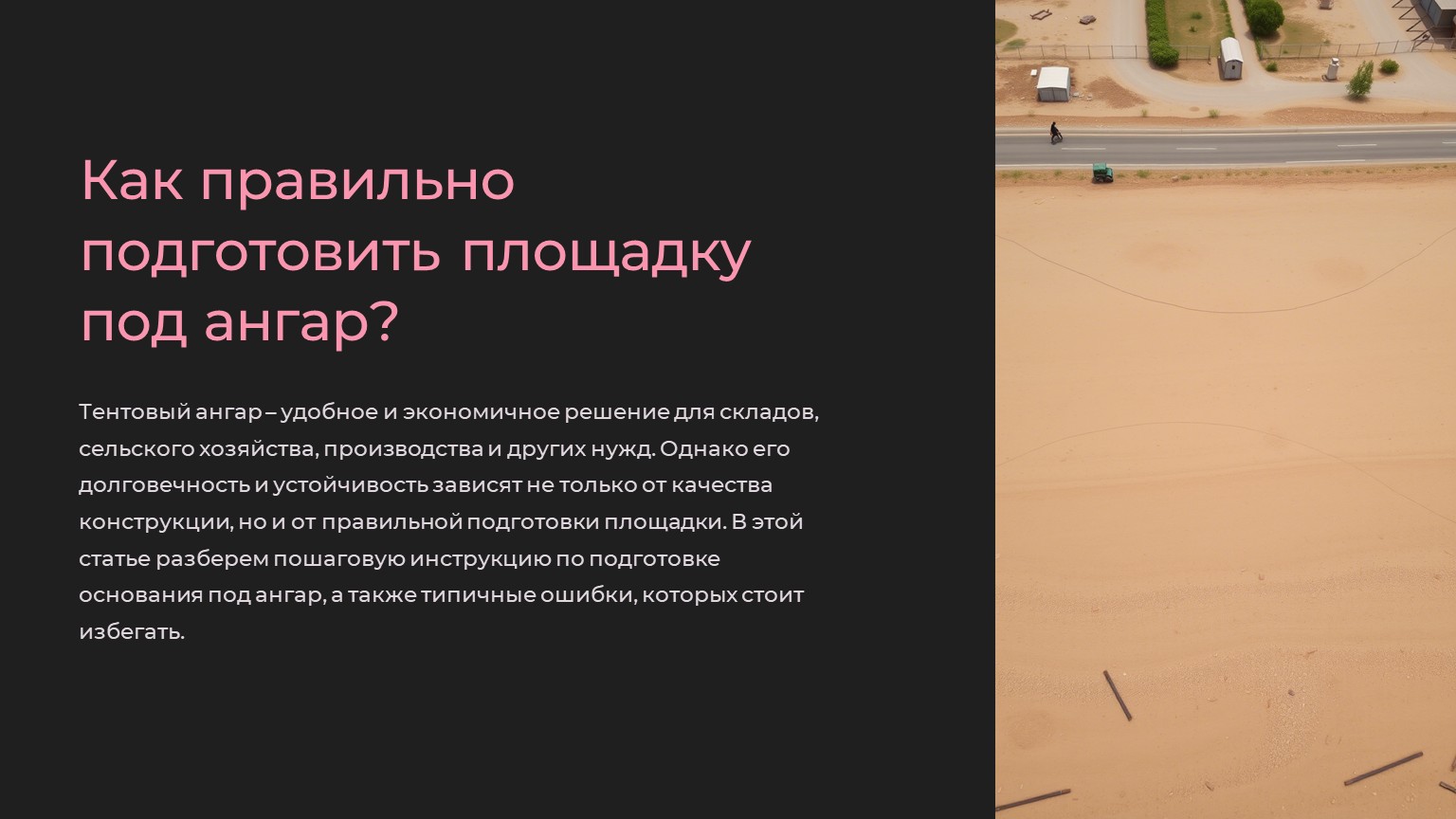 Тентовый ангар – удобное и экономичное решение для складов, сельского хозяйства, производства и других нужд. Однако его долговечность и устойчивость зависят не только от качества конструкции, но и от правильной подготовки площадки. В этой статье разберем пошаговую инструкцию по подготовке основания под ангар, а также типичные ошибки, которых стоит избегать.