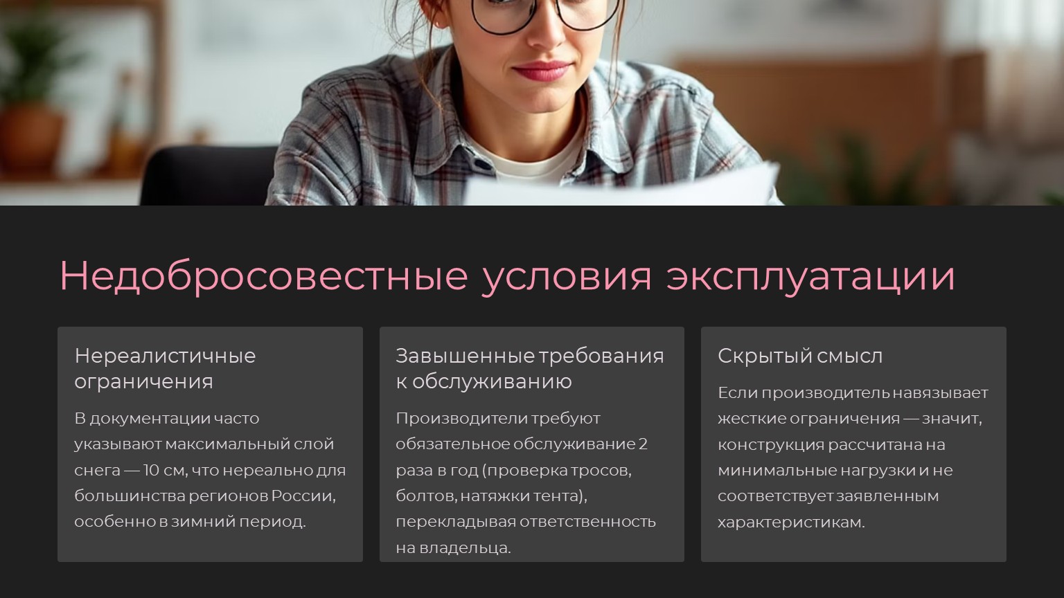 · Тент со временем растягивается, снег накапливается, а слабый каркас не выдерживает нагрузки.
