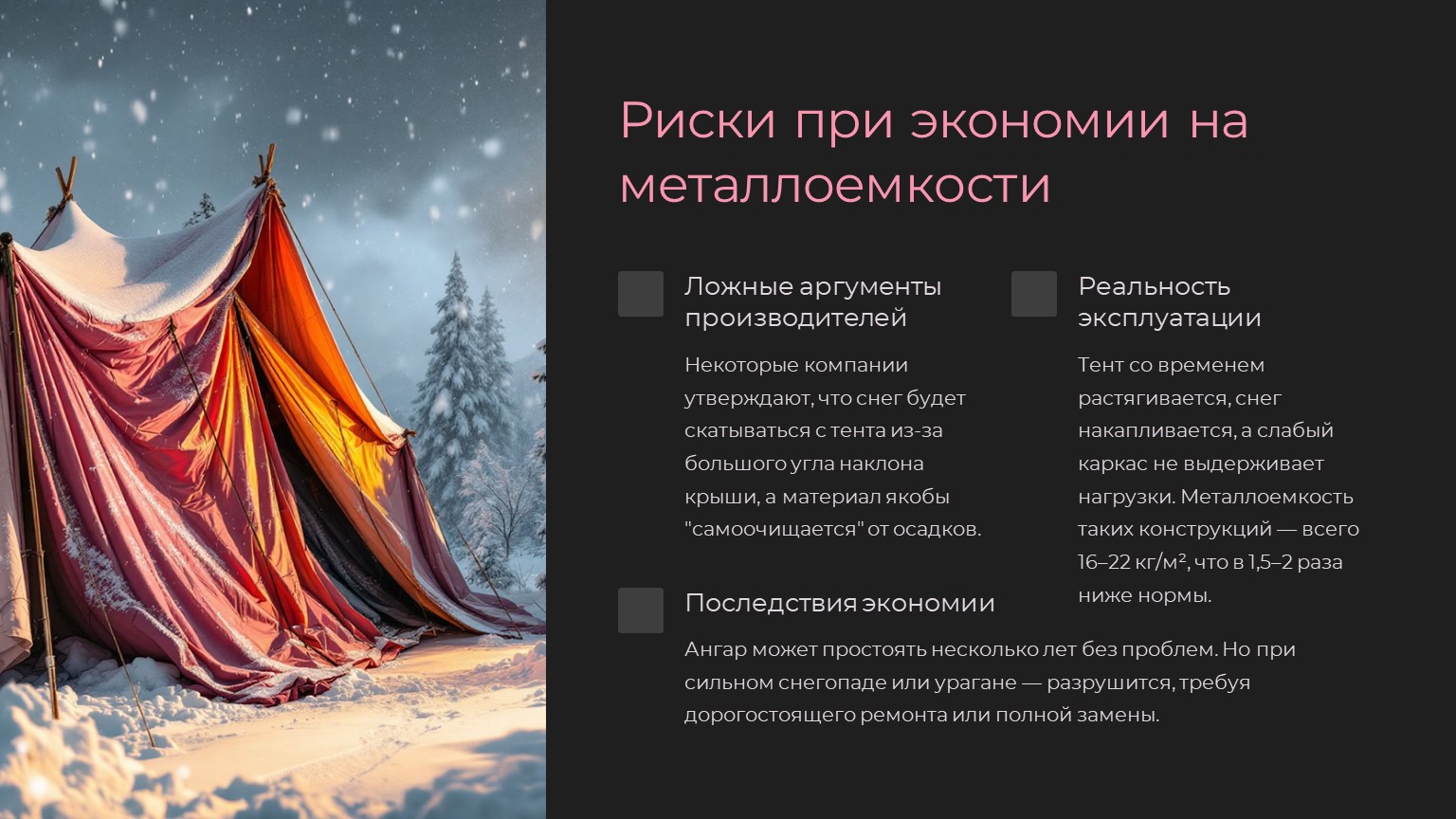 Дешевый ангар с низкой металлоемкостью — это всегда риск. Требуйте от поставщика расчеты нагрузок, проверяйте сечение каркаса и качество материалов. Лучше заплатить немного больше, чем потом тратить деньги на ремонт или замену разрушенной конструкции.