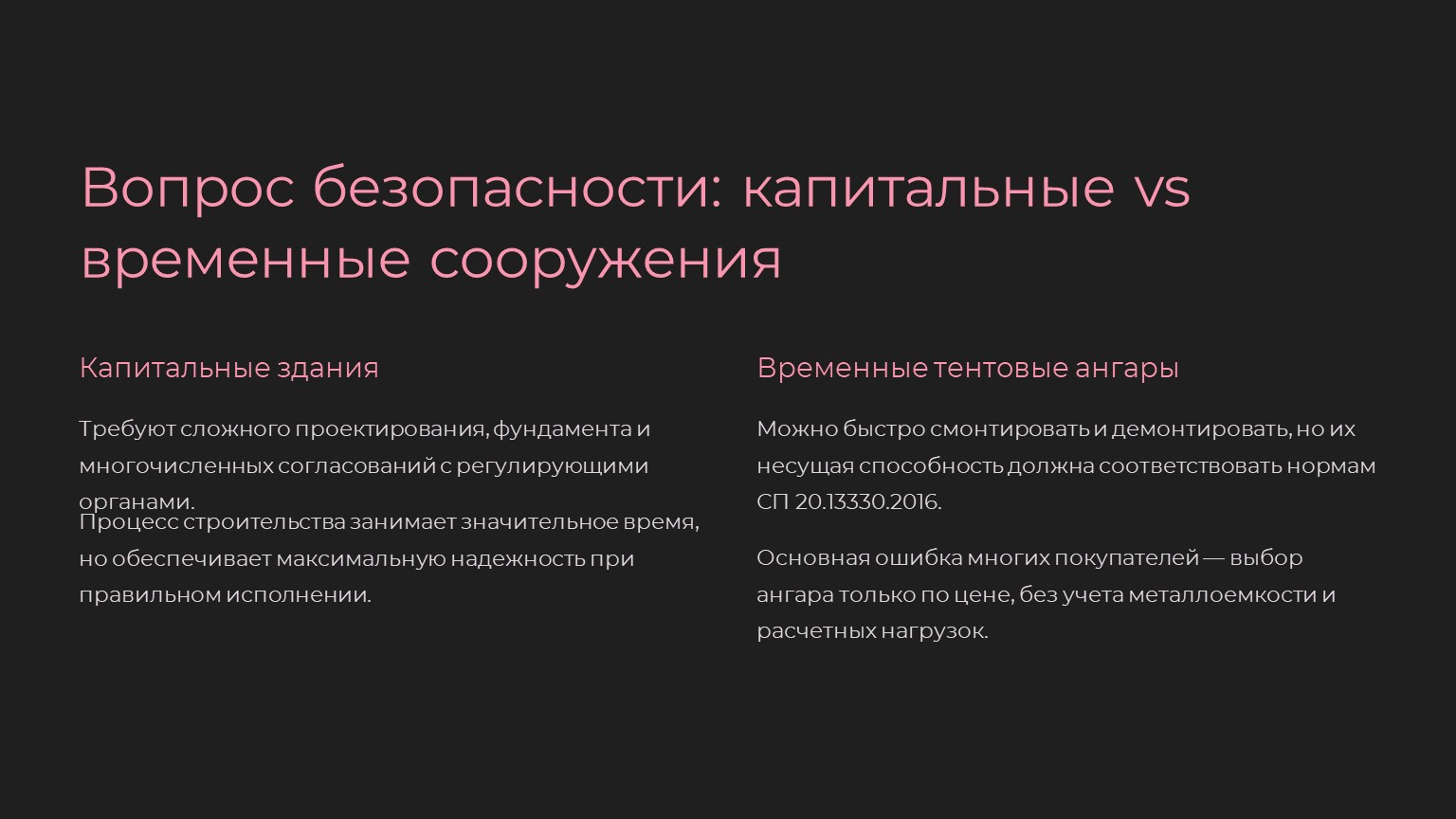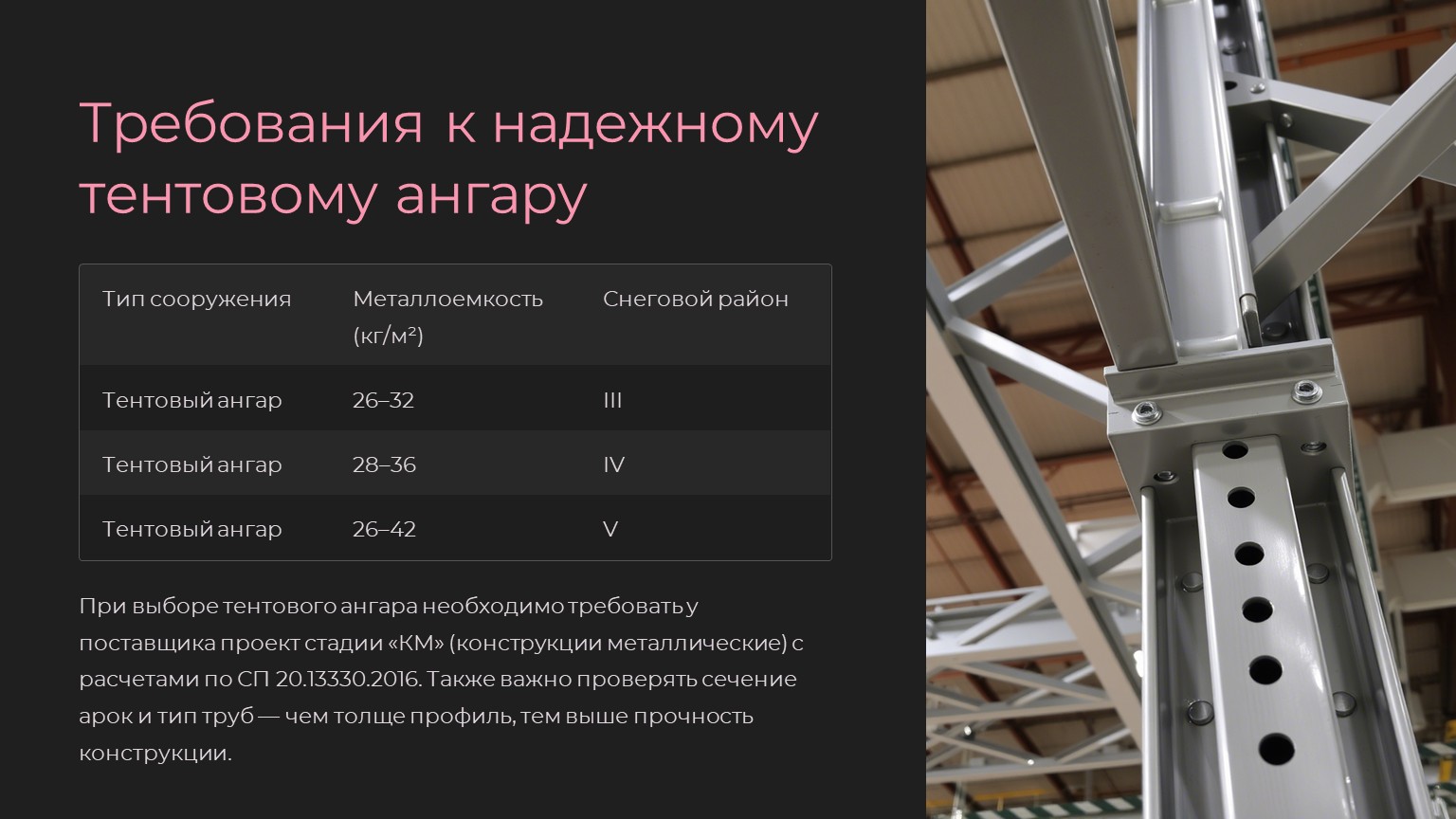 · Временные тентовые ангары можно быстро смонтировать и демонтировать, но их несущая способность должна соответствовать нормам СП 20.13330.2016.