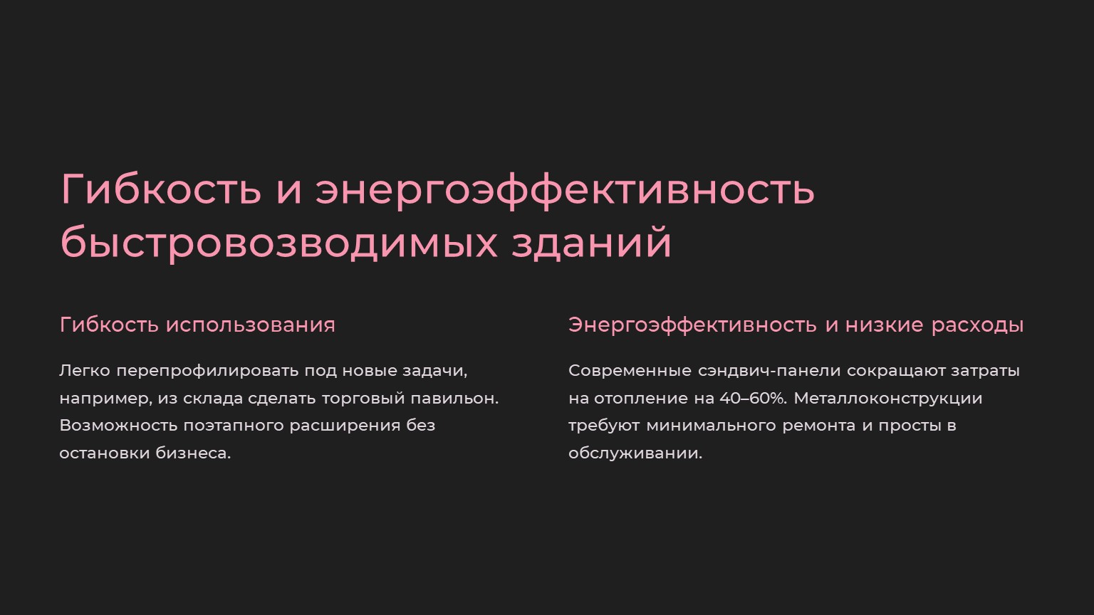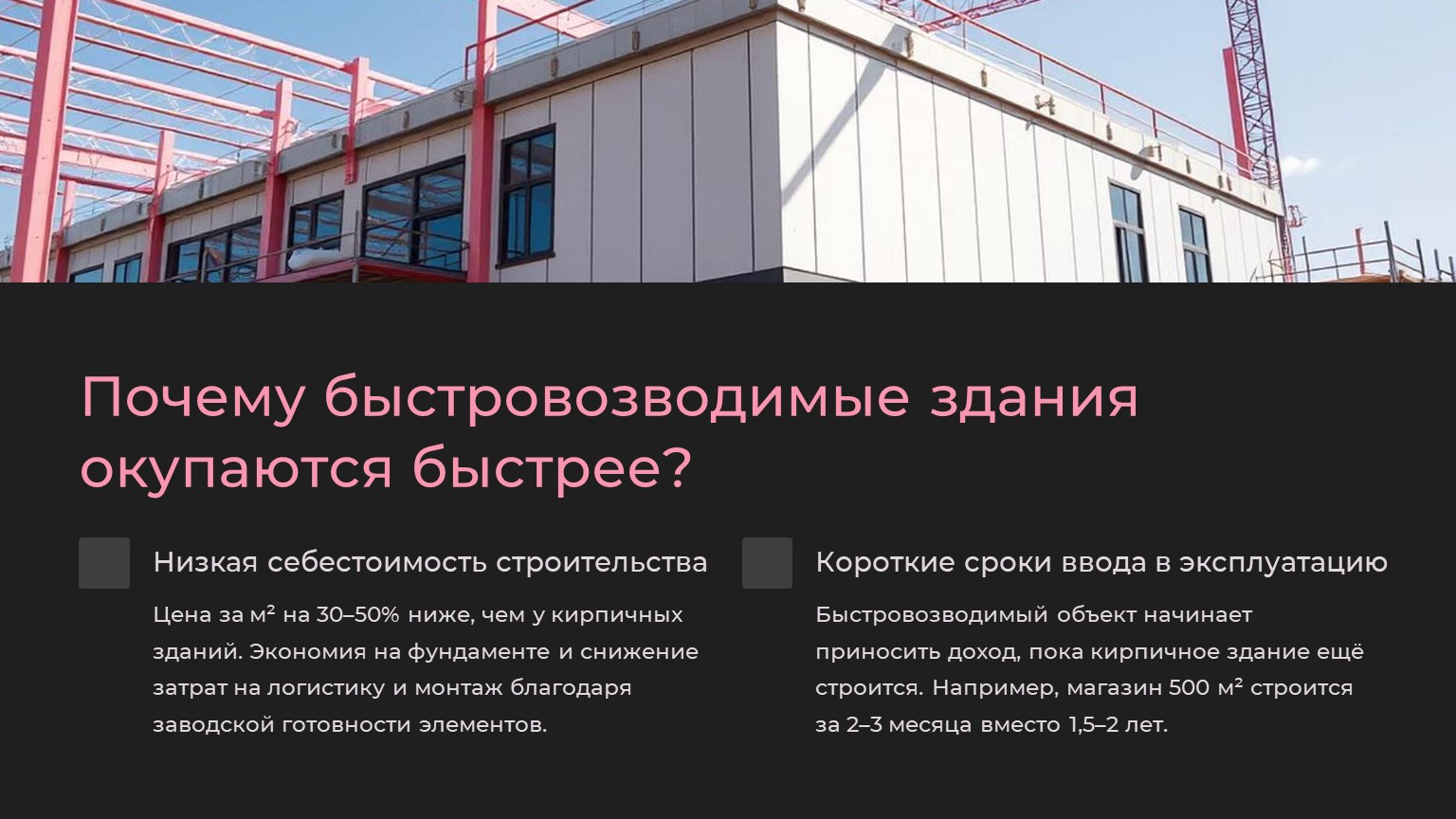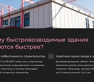 · Пример: магазин площадью 500 м² можно построить за 2–3 месяца вместо 1,5–2 лет.