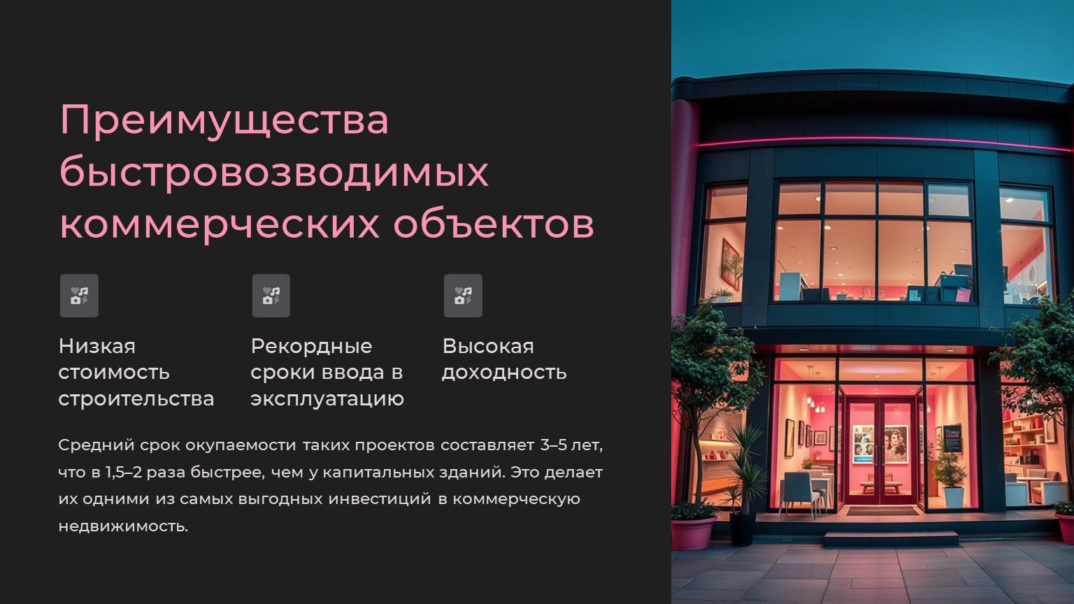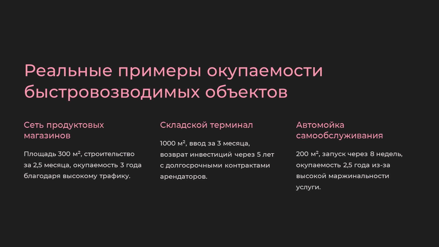 Средний срок окупаемости таких проектов – 3–5 лет, что в 1,5–2 раза быстрее, чем у капитальных зданий.