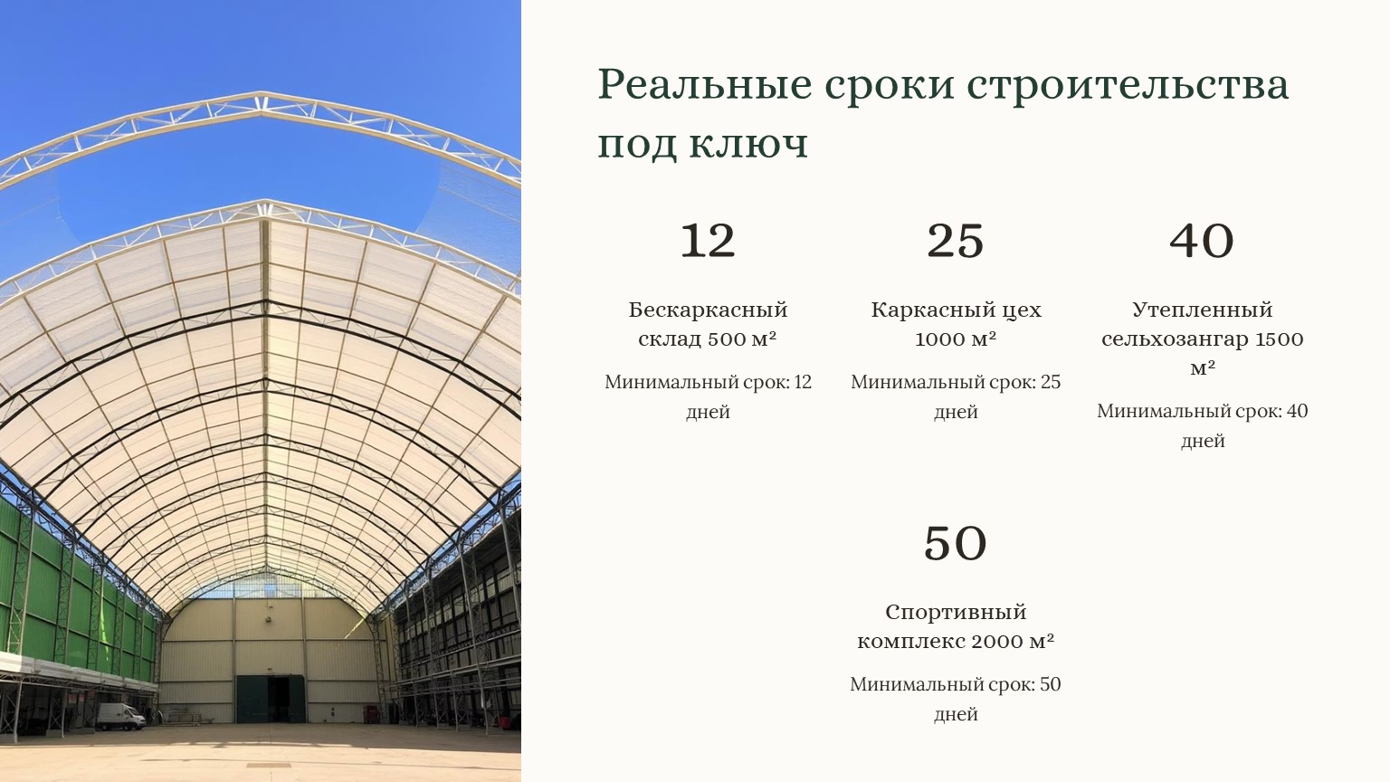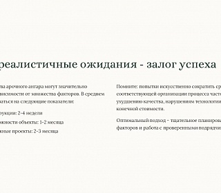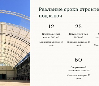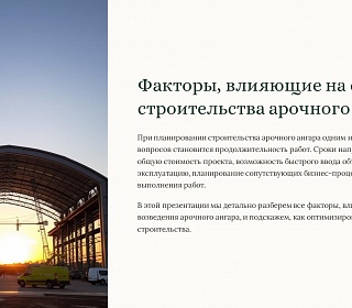 При планировании строительства арочного ангара одним из главных вопросов становится продолжительность работ. Сроки напрямую влияют на: