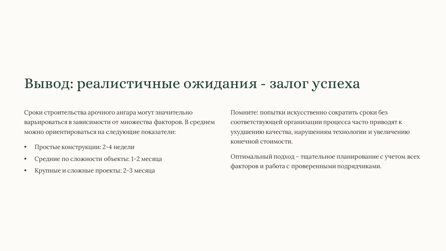 В этой статье мы детально разберем все факторы, влияющие на сроки возведения арочного ангара, и подскажем, как оптимизировать процесс строительства.