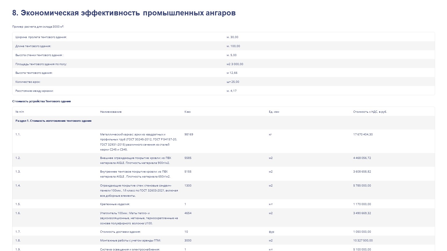 Раздел 1. Стоимость изготовления тентового здания |