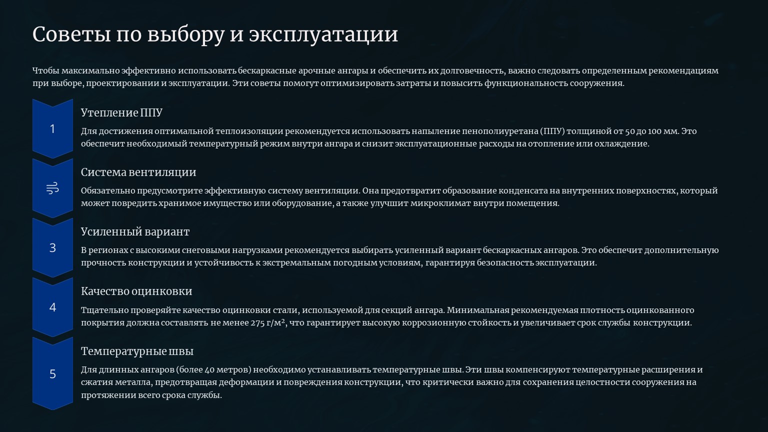- Для длинных ангаров (более 40 м) устанавливайте температурные швы