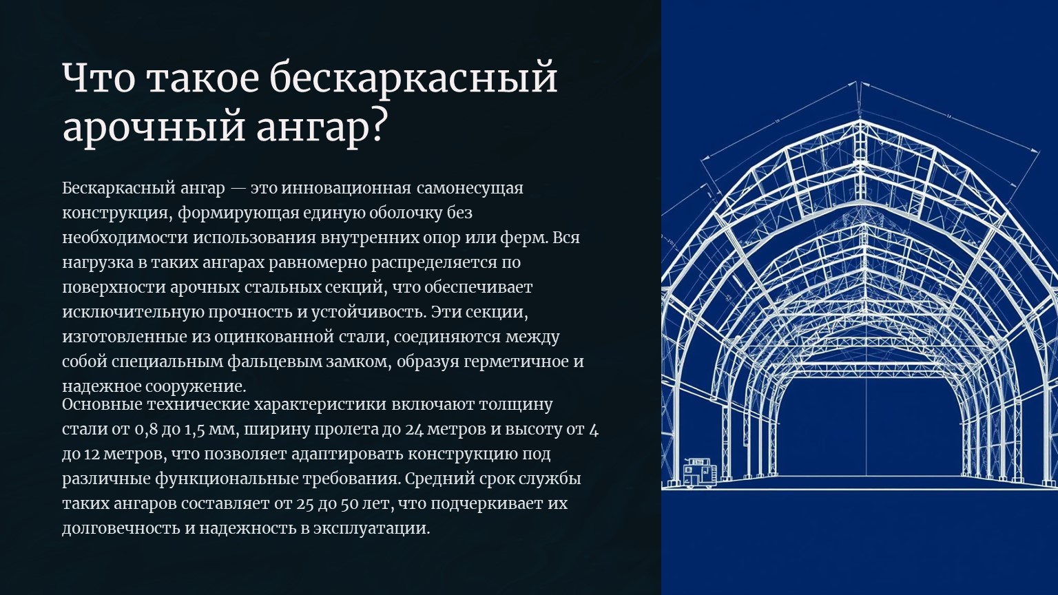 Бескаркасный ангар — это самонесущая конструкция, состоящая из стальных арочных секций, которые образуют единую оболочку без внутренних опор. В отличие от каркасных ангаров, здесь вся нагрузка распределяется по поверхности самой арки.