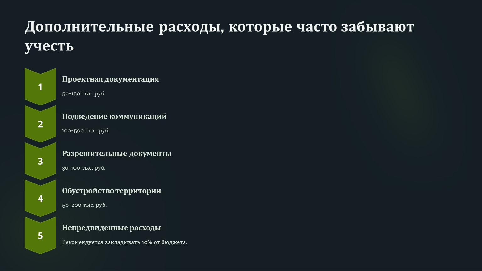 - Непредвиденные расходы (рекомендуется закладывать 10% от бюджета)