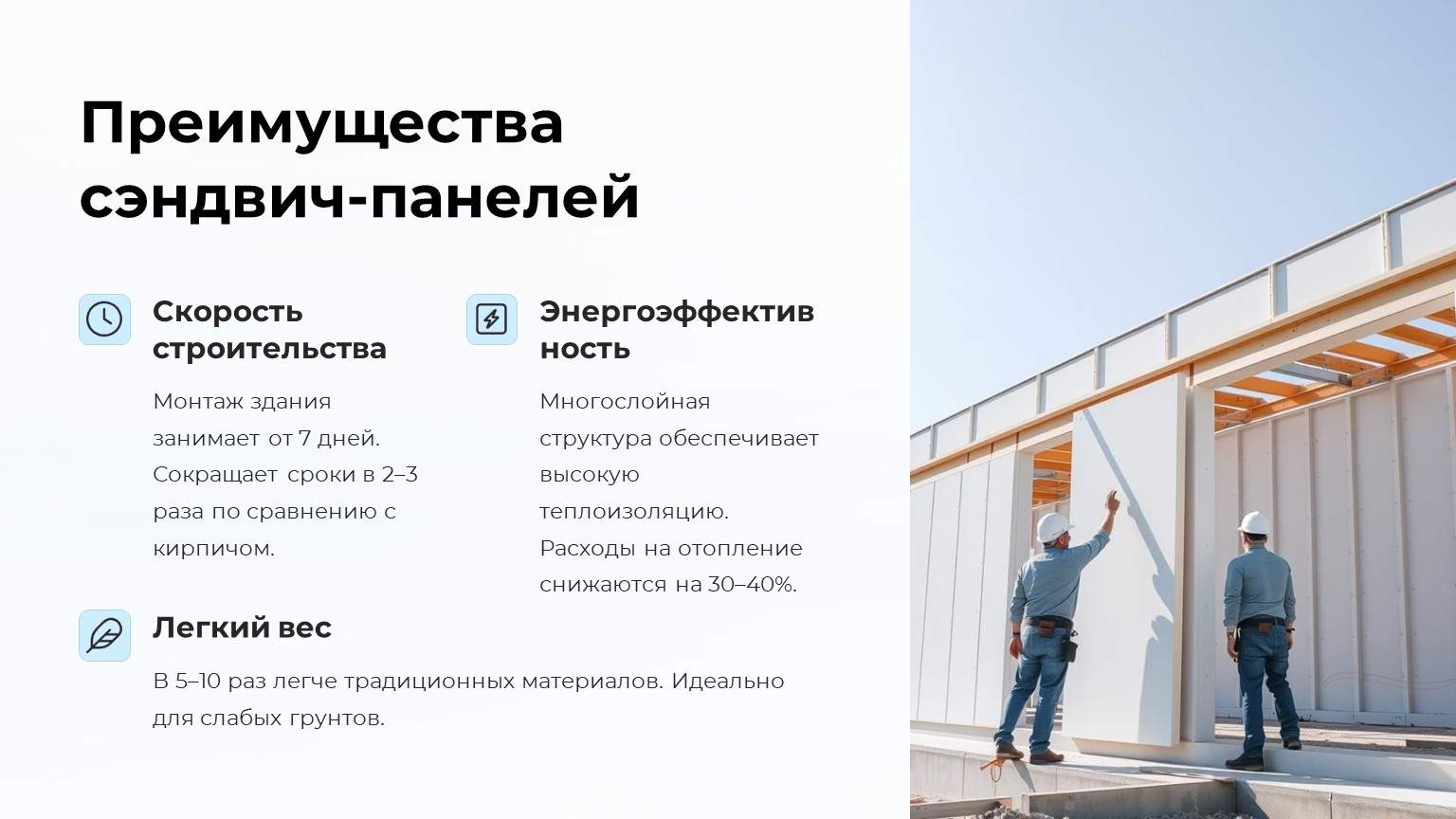 Панели в 5–10 раз легче традиционных материалов, что уменьшает нагрузку на фундамент. Идеально для слабых грунтов и реконструкции старых зданий.
