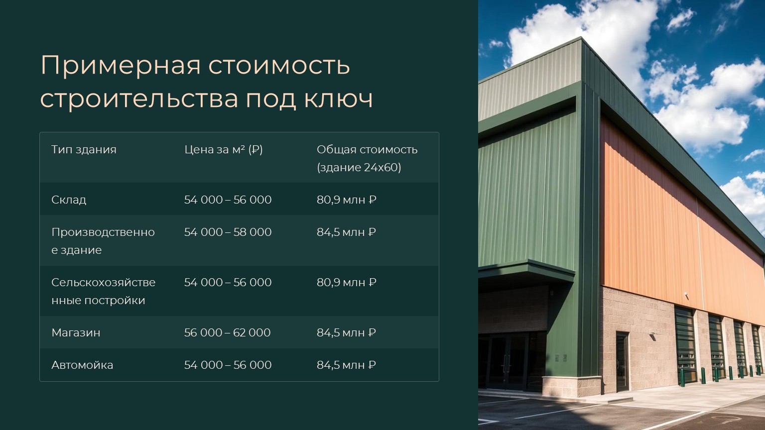 · Сельскохозяйственные постройки (фермы, ангары) – от 21 000 ₽/м².