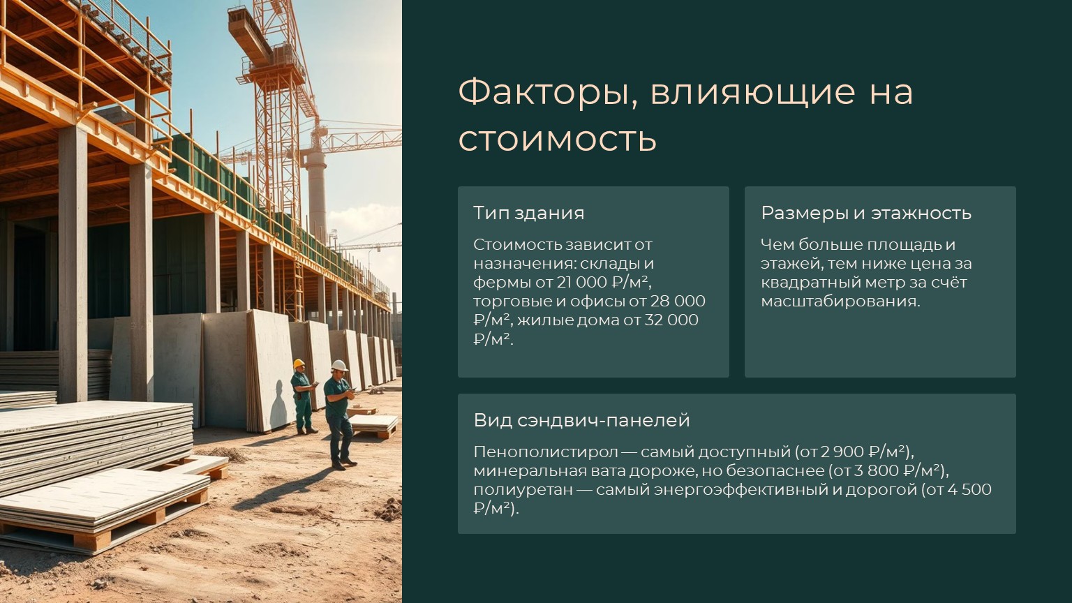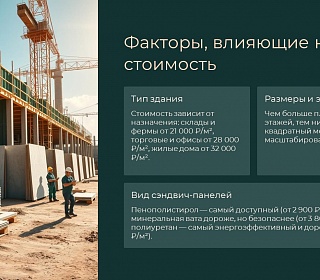 Цена возведения здания из сэндвич-панелей зависит от нескольких ключевых факторов: