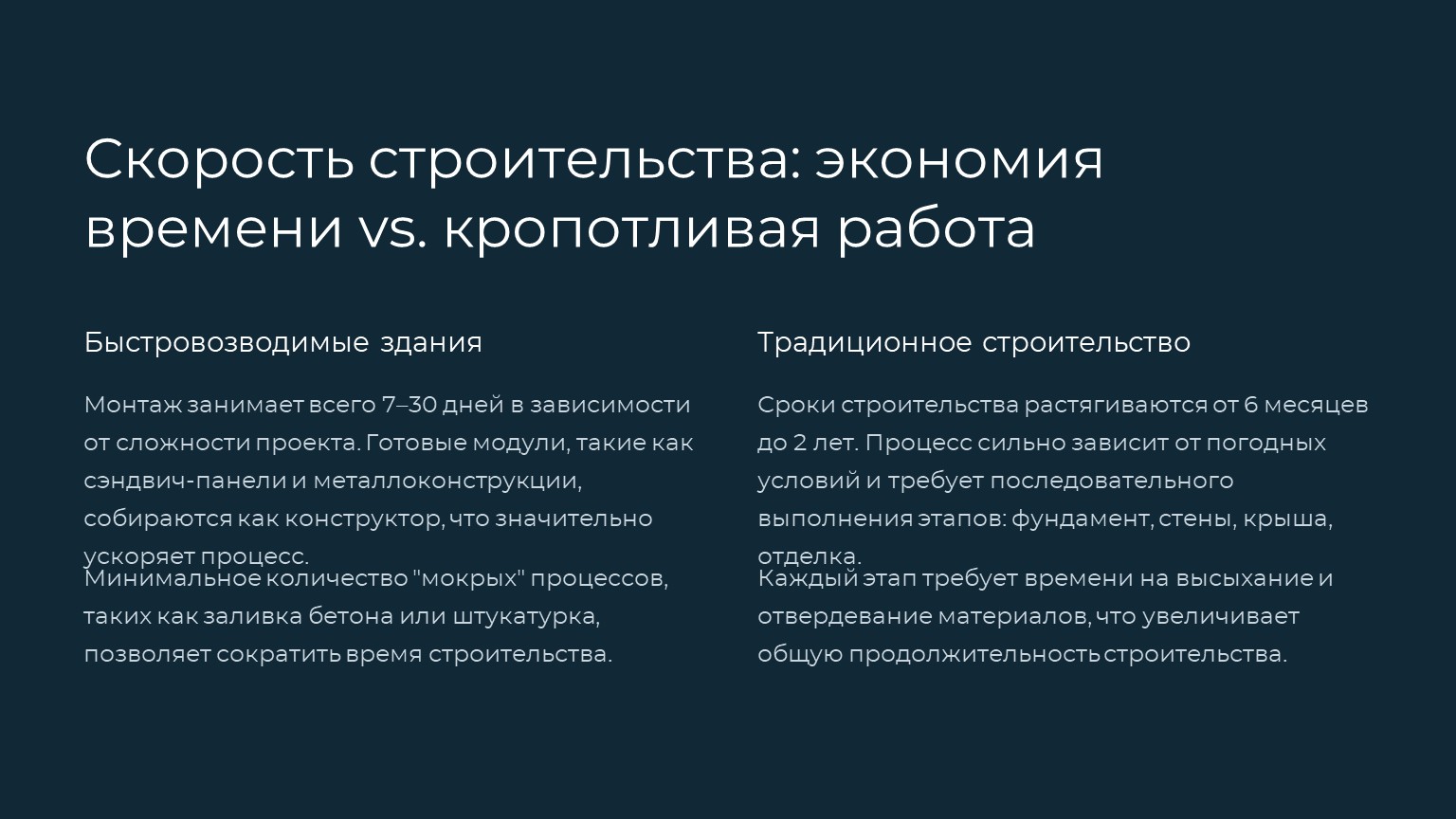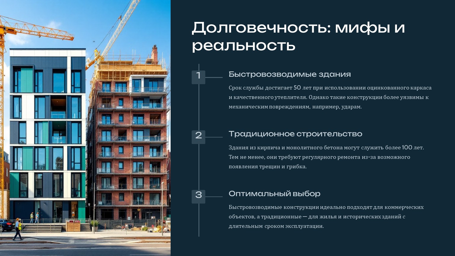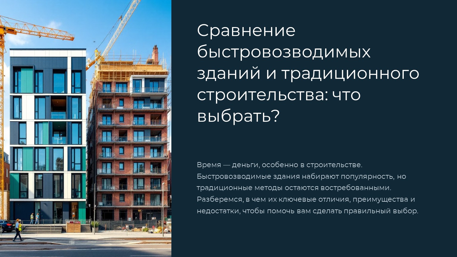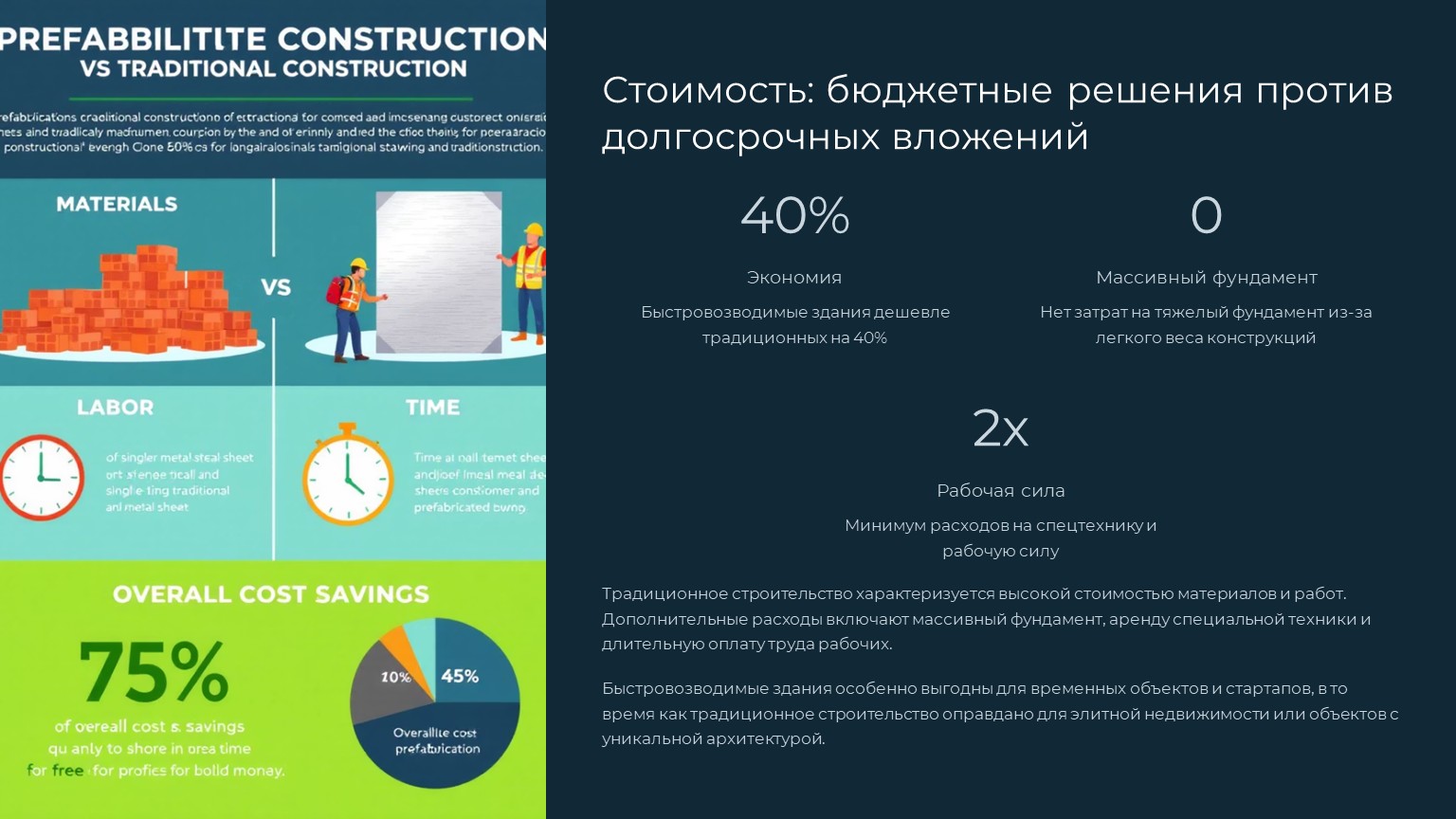 Итог: Быстровозводимые здания выгодны для временных объектов и стартапов. Традиционное строительство оправдано для элитной недвижимости или объектов с уникальной архитектурой.