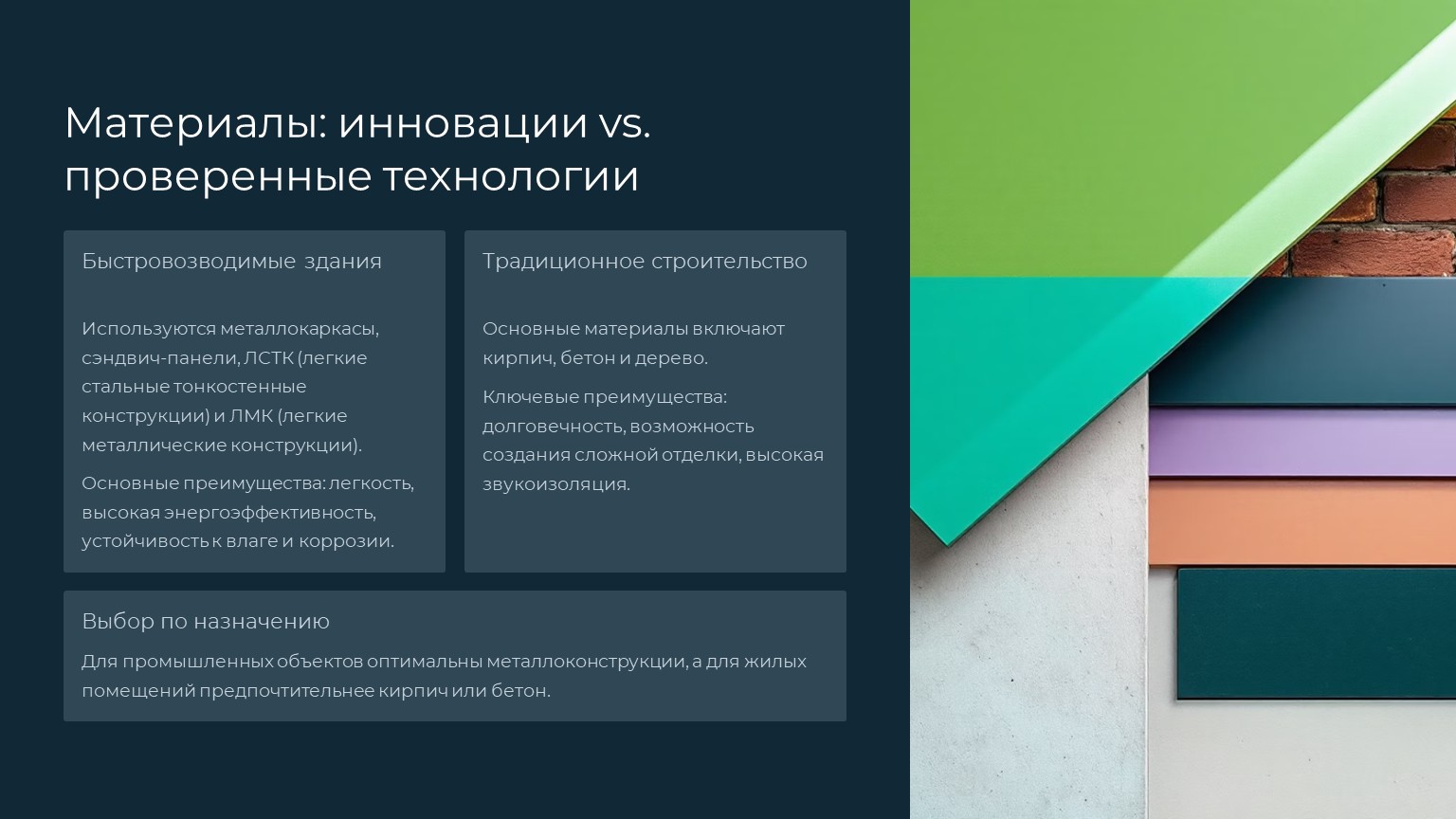 Итог: Быстровозводимые конструкции подходят для коммерческих объектов, традиционные — для жилья и исторических зданий.