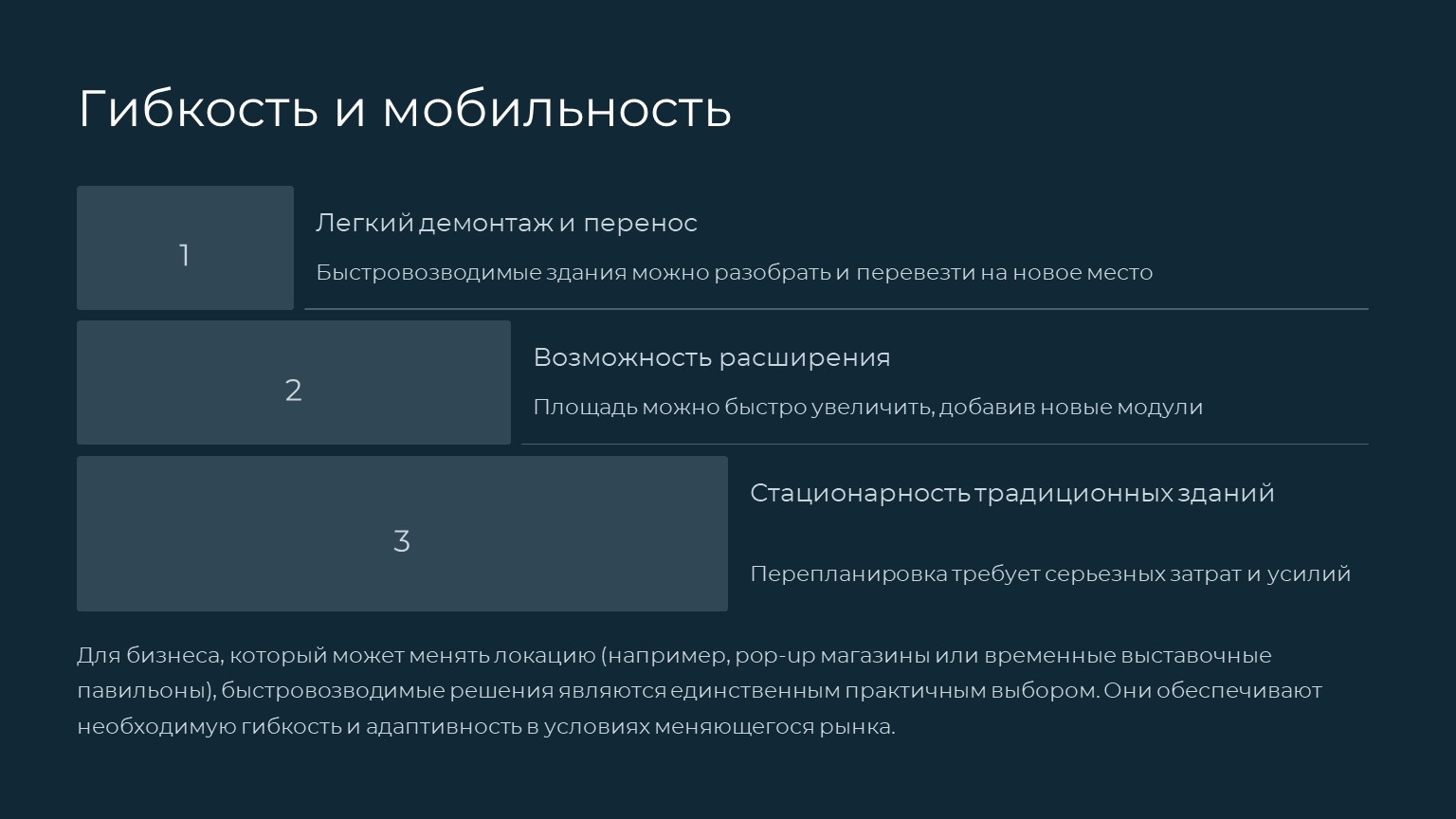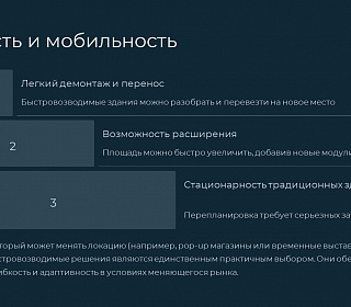 Итог: Для бизнеса, который может менять локацию (например, pop-up магазины), — только быстровозводимые решения.