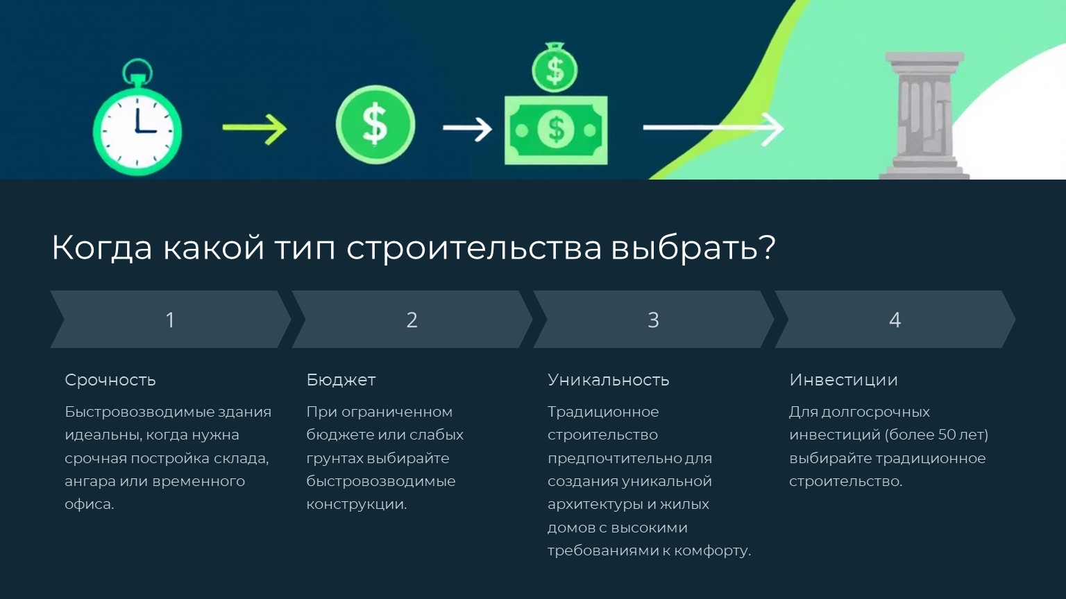 Итог: Быстровозводимые конструкции идеальны для срочных проектов (склады, магазины, временные офисы).