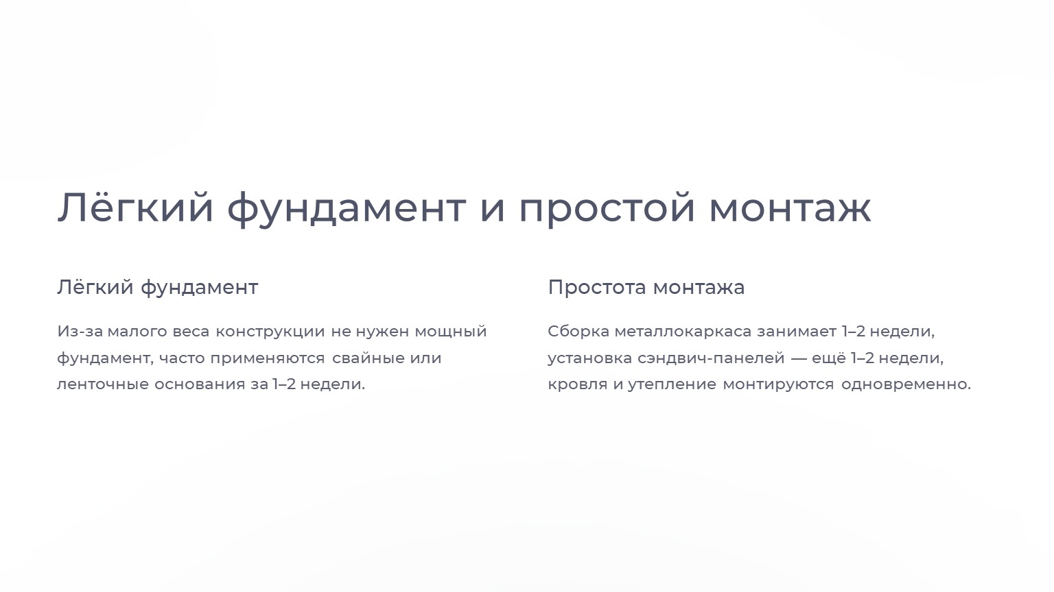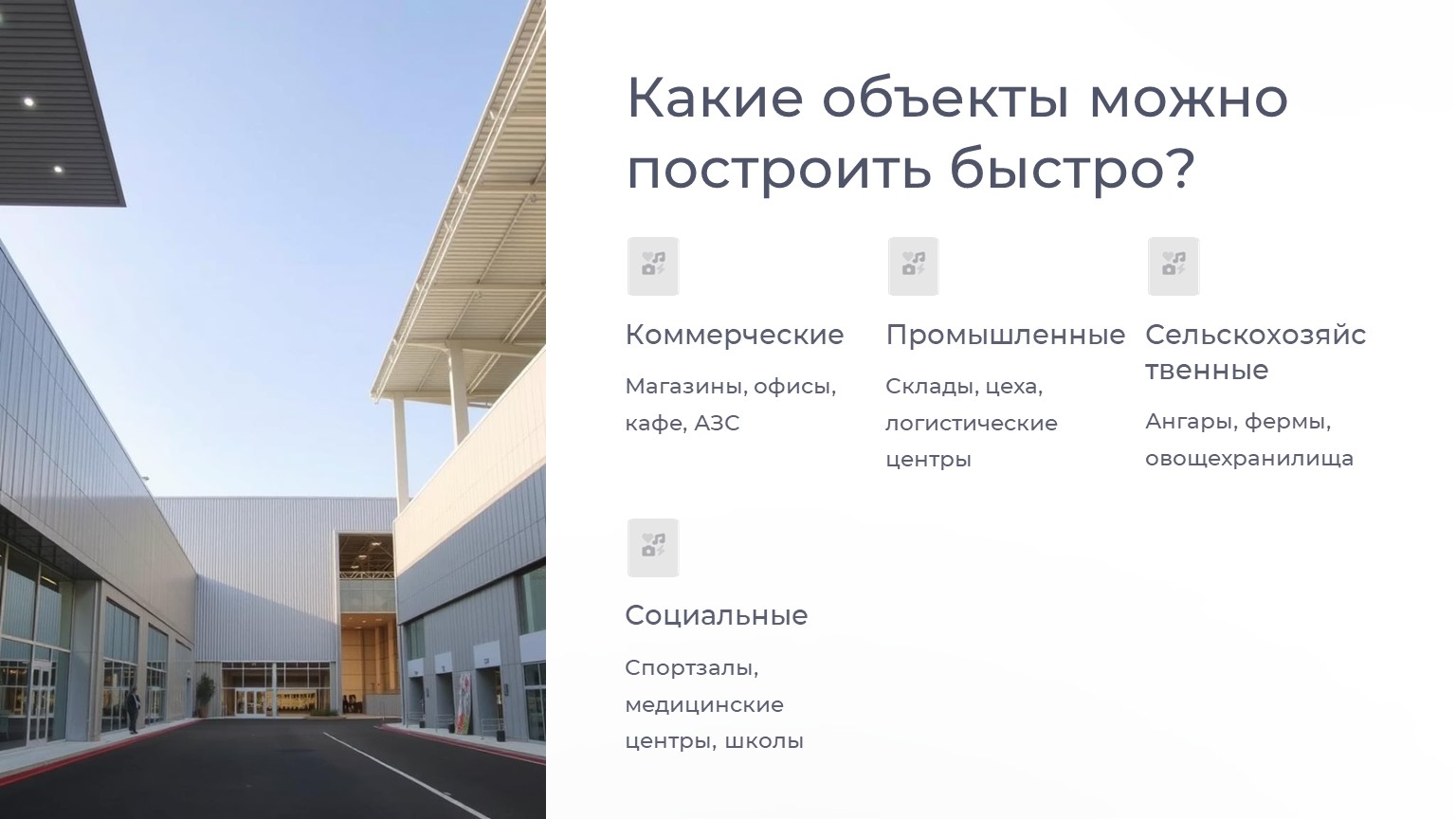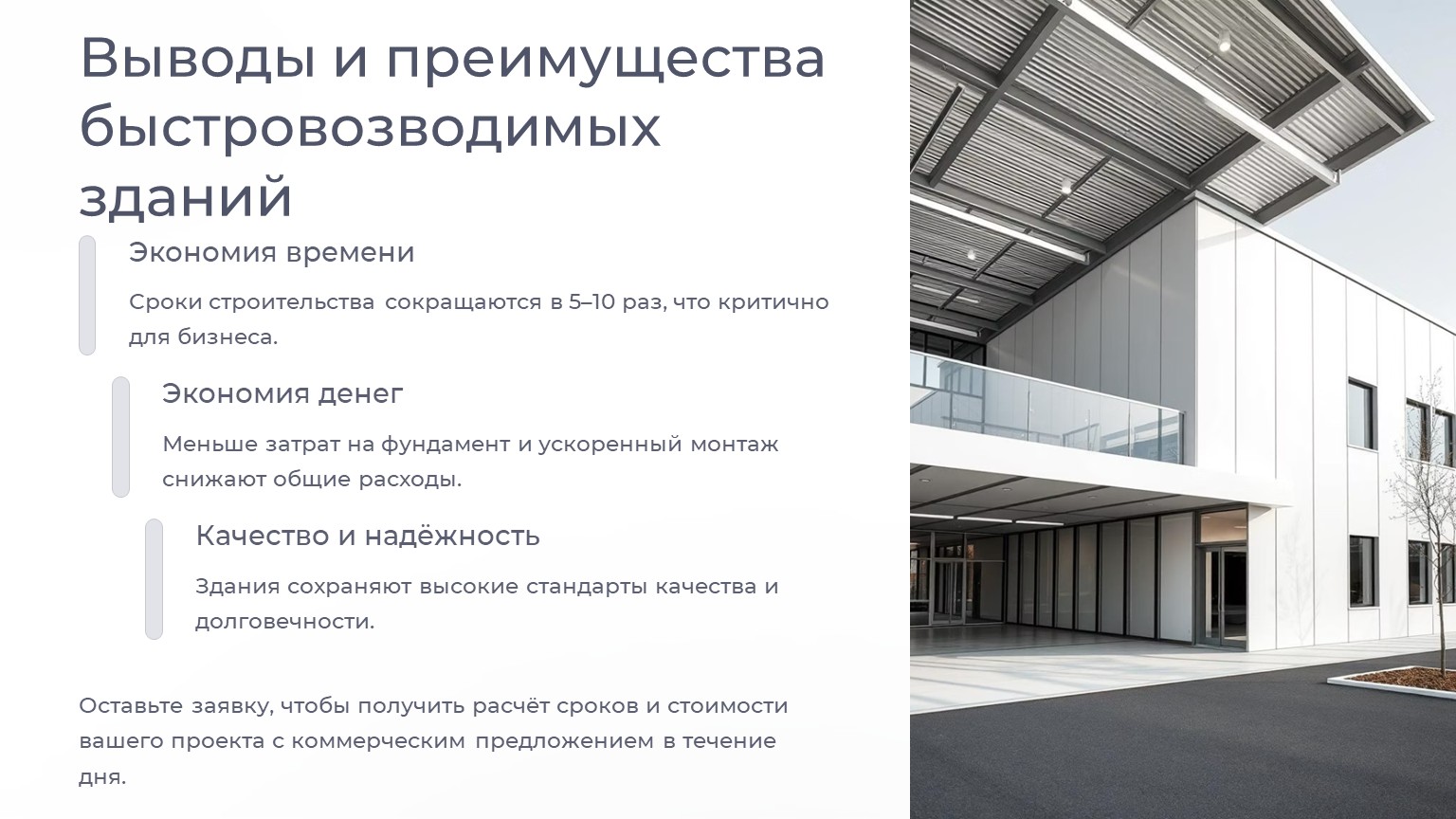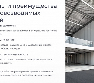Быстровозводимые здания – это экономия времени и денег без потери качества. Сроки строительства сокращаются в 5–10 раз, что особенно важно для бизнеса, где каждый день простоя – это упущенная прибыль.