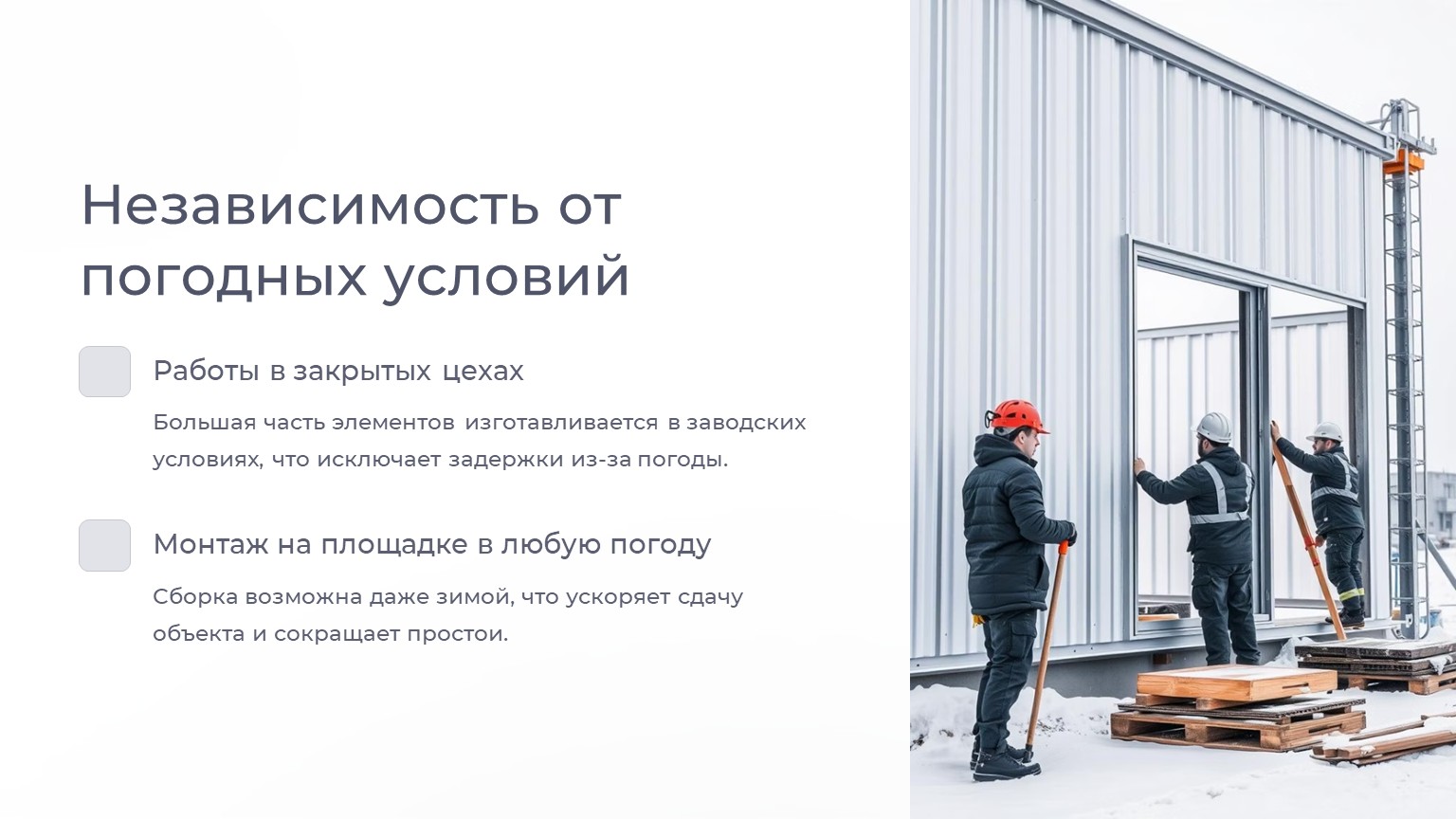 · На площадке монтаж возможен даже зимой, что ускоряет сдачу объекта.