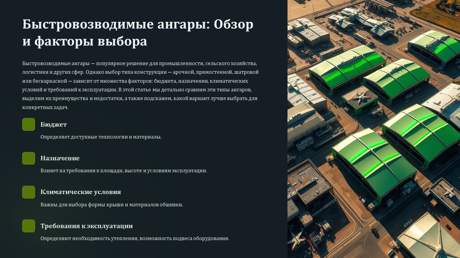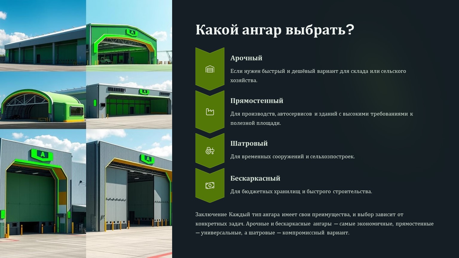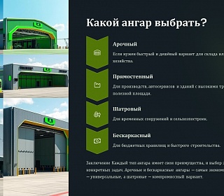 Каждый тип ангара имеет свои преимущества, и выбор зависит от конкретных задач. Арочные и бескаркасные ангары — самые экономичные, прямостенные — универсальные, а шатровые — компромиссный вариант.