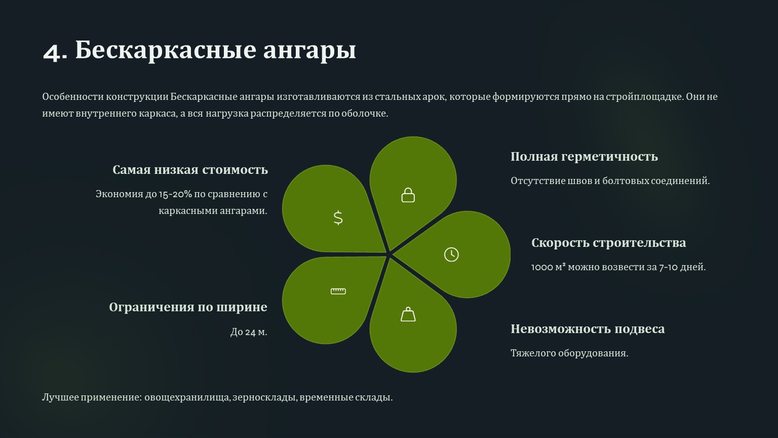 Лучшее применение: зернохранилища, склады, спортивные сооружения, временные ангары.