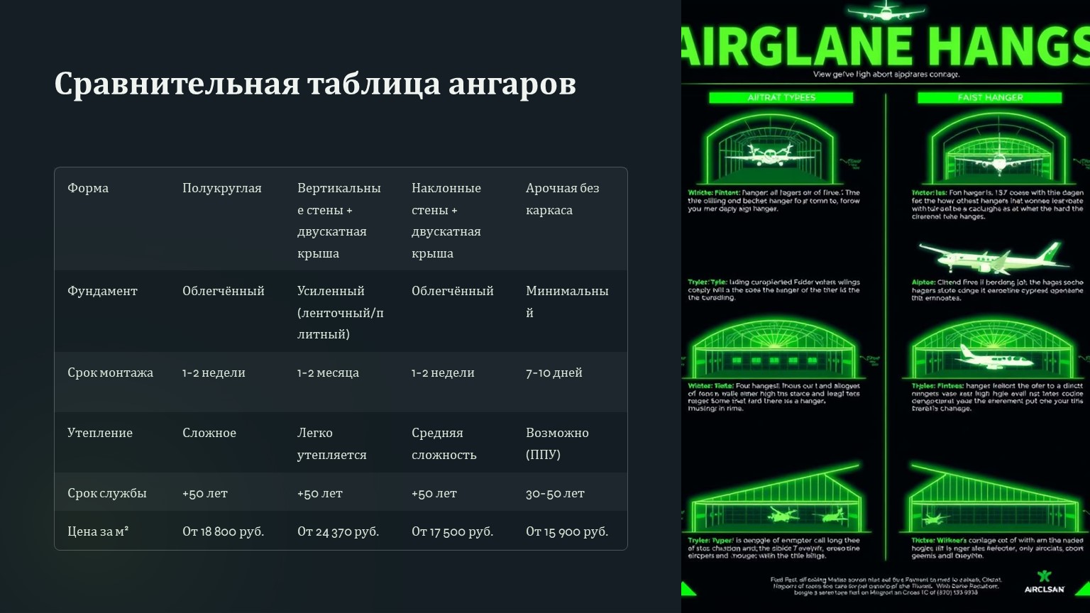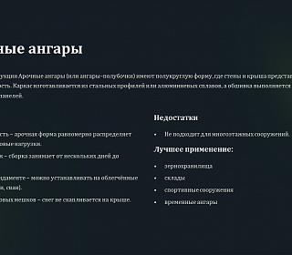 Сравнительная таблица арочных, прямостенных, шатровых и бескаркасных ангаров