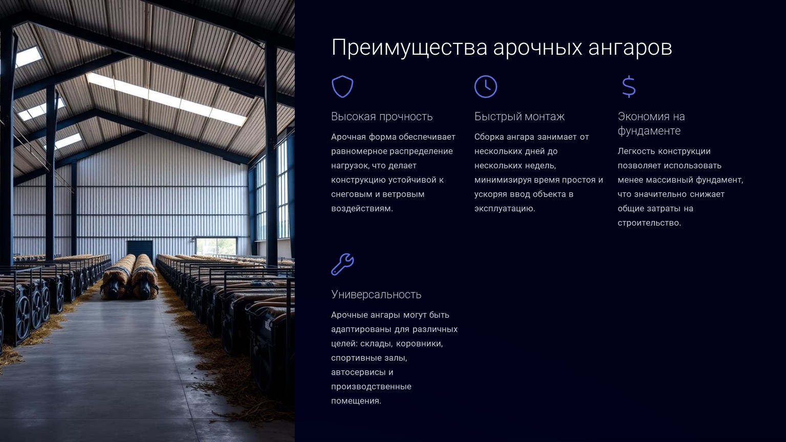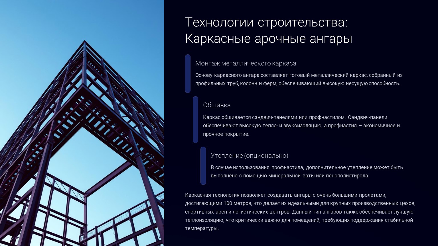 Арочные ангары – это современные, прочные и экономичные конструкции, которые строят из оцинкованной стали, алюминия и полимерных материалов. Выбор технологии зависит от назначения сооружения, климатических условий и бюджета.