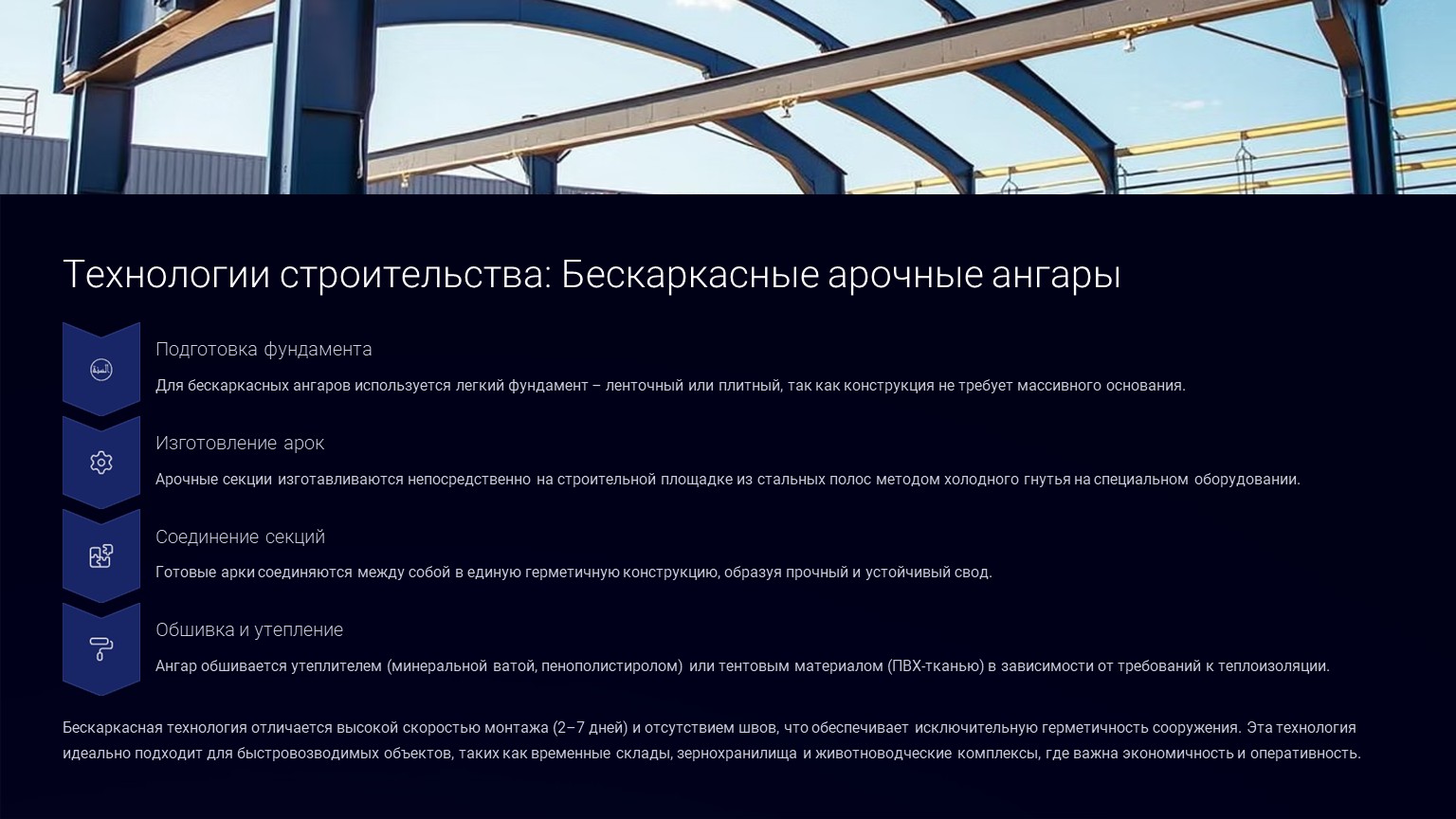 Узнайте, из каких материалов строят арочные ангары и какие технологии применяют. Сравнение бескаркасных и каркасных конструкций.