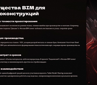 - Компания Voortman Steel Group использует BIM для автоматического формирования технологических карт, что сокращает время производства на 20-30%.